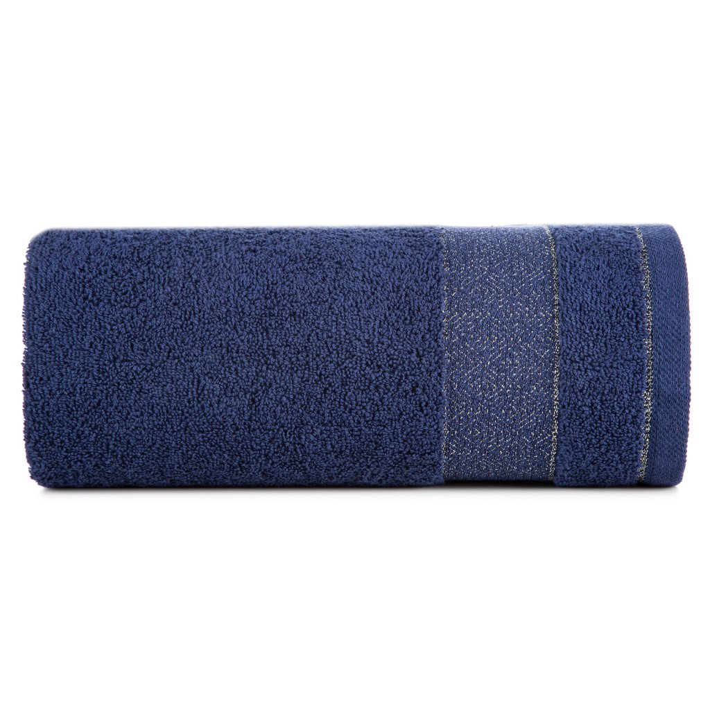 Ručník z měkké a savé bavlněné tkaniny s froté vazbou, zdobený barevným lemem ve stylu bastingu. Šířka: 70 cm, délka: 140 cm, barva: tmavě modrá, gramáž: 500 GSM, složení: 100% bavlna; ozdobná část: 50% bavlna, 50% polyester.Doplňkové parametry