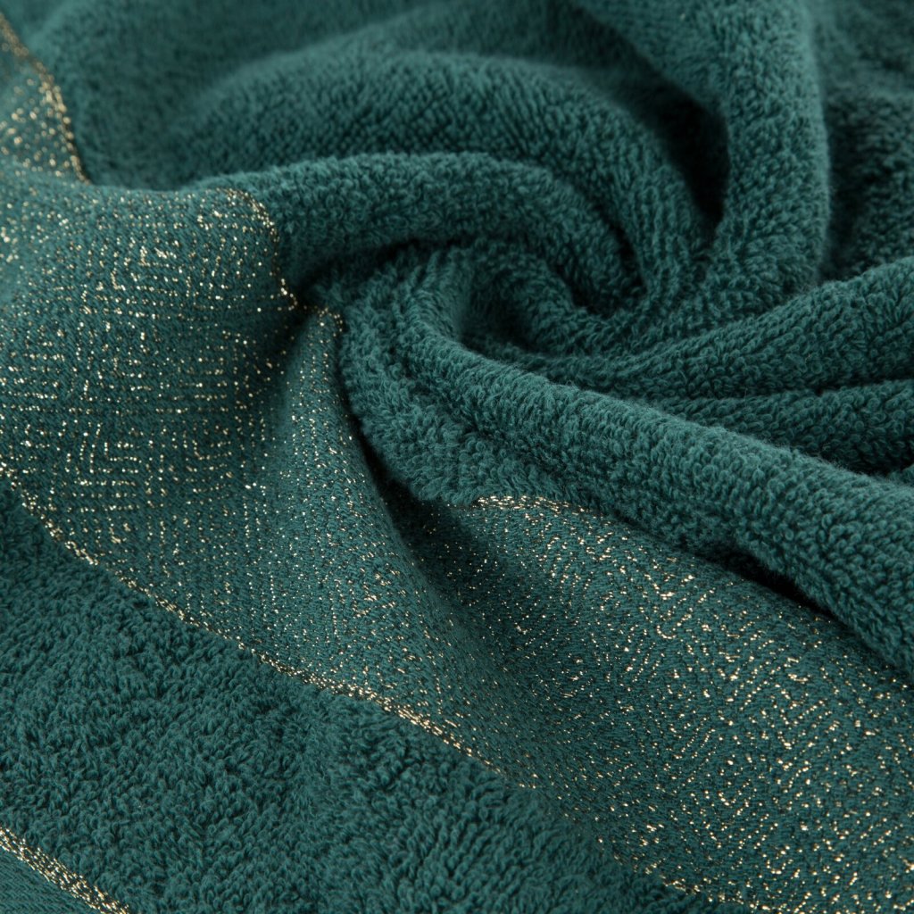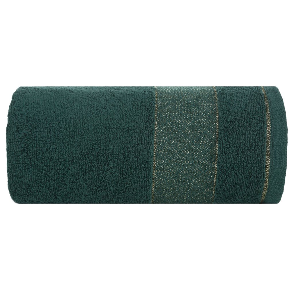 Ručník z měkké a savé bavlněné tkaniny s froté vazbou, zdobený barevným lemem ve stylu bastingu. Šířka: 70 cm, délka: 140 cm, barva: tmavě zelená, gramáž: 500 GSM, složení: 100% bavlna; ozdobná část: 50% bavlna, 50% polyester.Doplňkové parametry