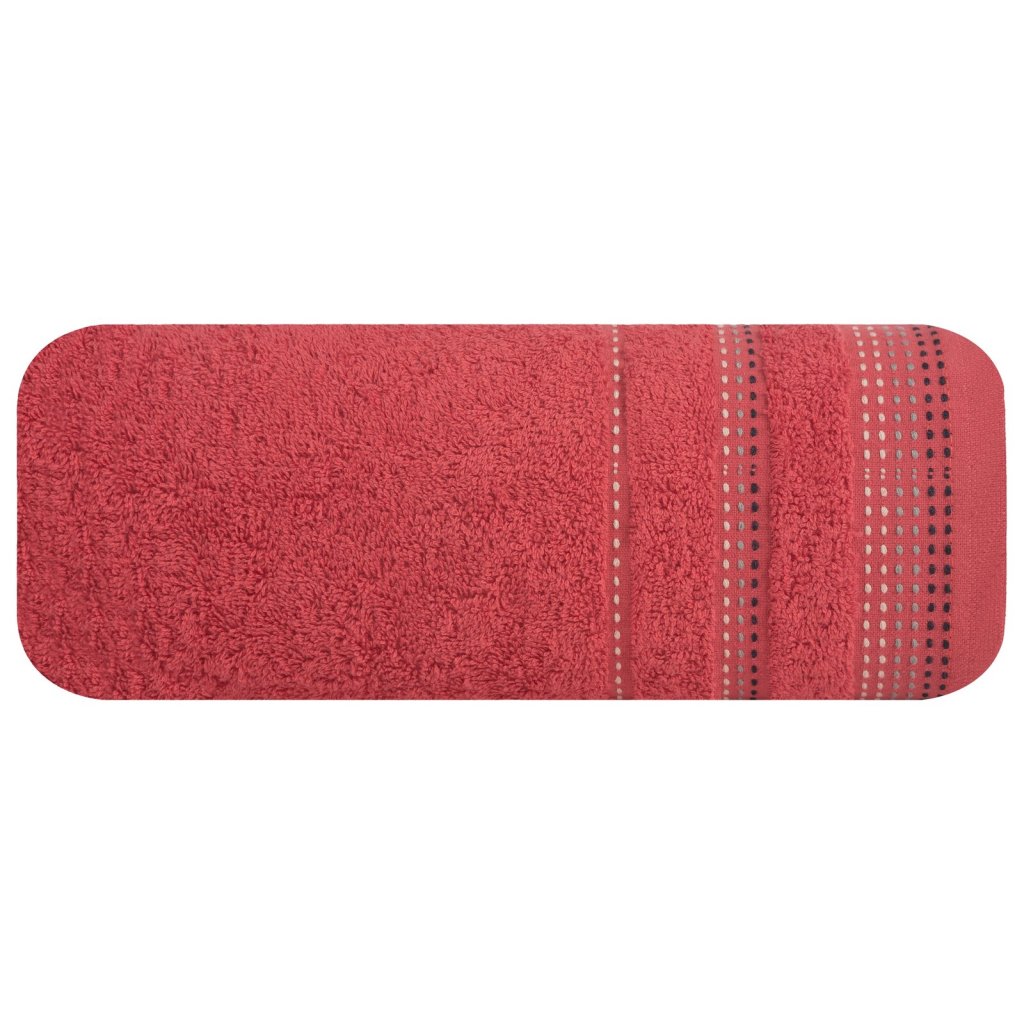 Jednobarevný ručník z měkké a savé bavlněné tkaniny s froté vazbou zdobený barevným lemováním. Šířka: 30 cm, délka: 50 cm, barva: červená, hmotnost: 500 GSM, složení: 100 % bavlna.Doplňkové parametry