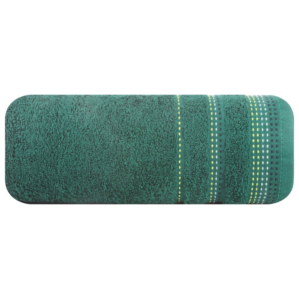 Jednobarevný ručník z měkké a savé bavlněné tkaniny s froté vazbou zdobený barevným lemováním. Šířka: 70 cm, délka: 140 cm, barva: zelená, hmotnost: 500 GSM, složení: 100 % bavlna.Doplňkové parametry