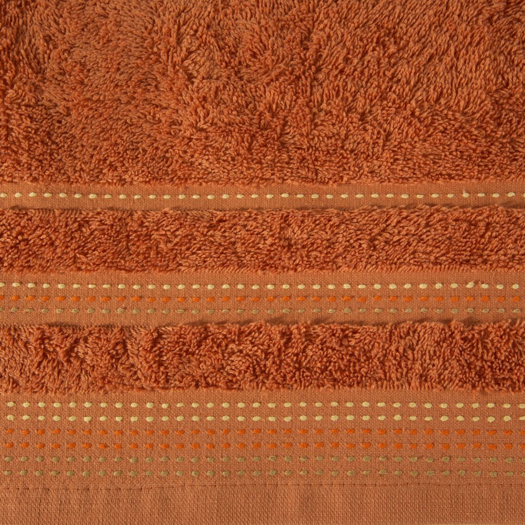 Jednobarevný ručník z měkké a savé bavlněné tkaniny s froté vazbou zdobený barevným lemováním. Šířka: 50 cm, délka: 90 cm, barva: oranžová, hmotnost: 500 GSM, složení: 100 % bavlna.Doplňkové parametry