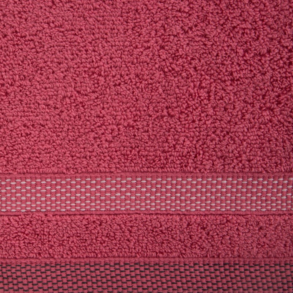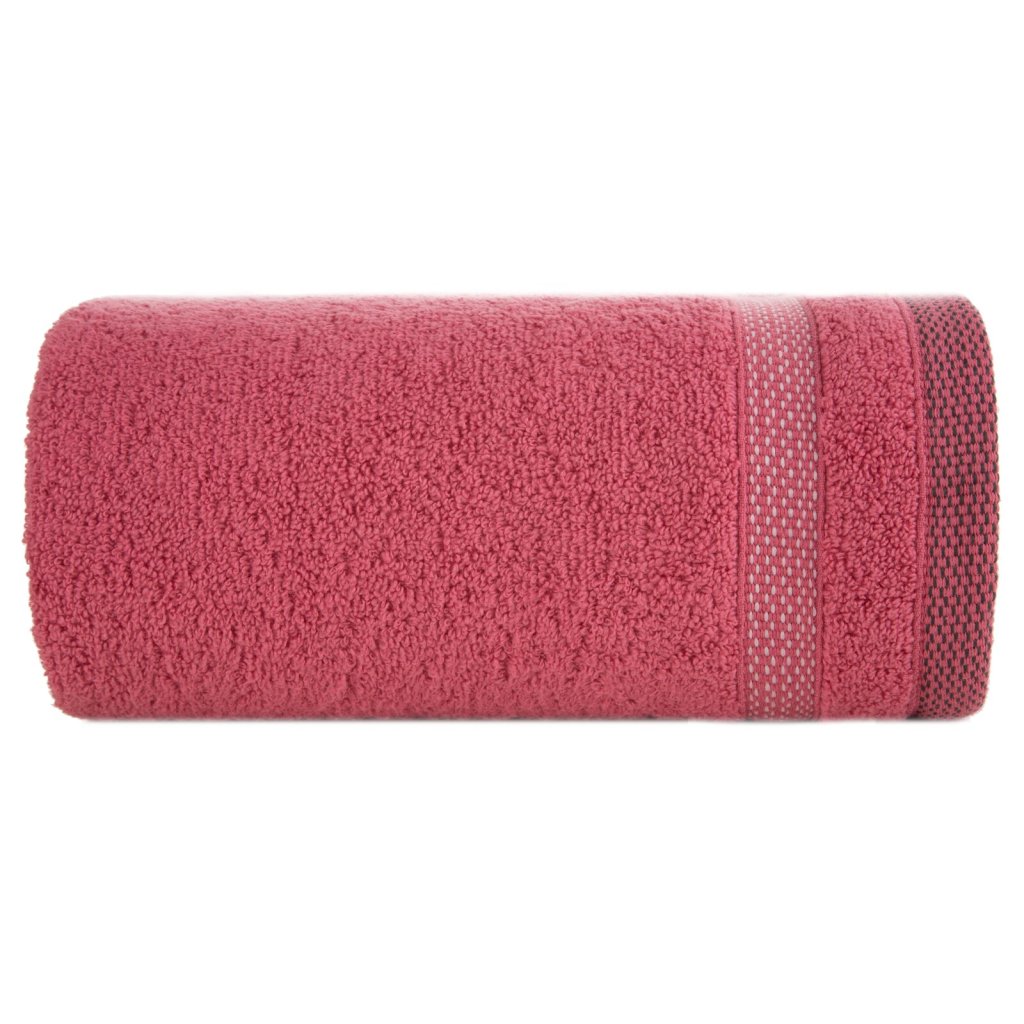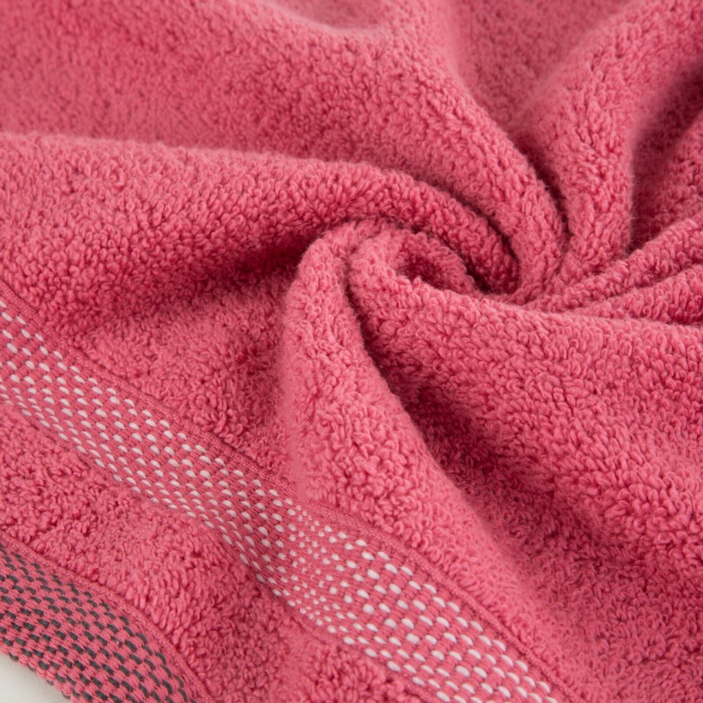 Ručník s froté bavlněnou strukturou klasického charakteru zdobený elegantním pruhovaným lemem s lesklými nitěmi. Šířka: 30 cm, délka: 50 cm, barva: korálová, gramáž: 400 GSM, složení: 100% bavlna; ozdobná část: 50% bavlna, 50% polyester.Doplňkové parametry