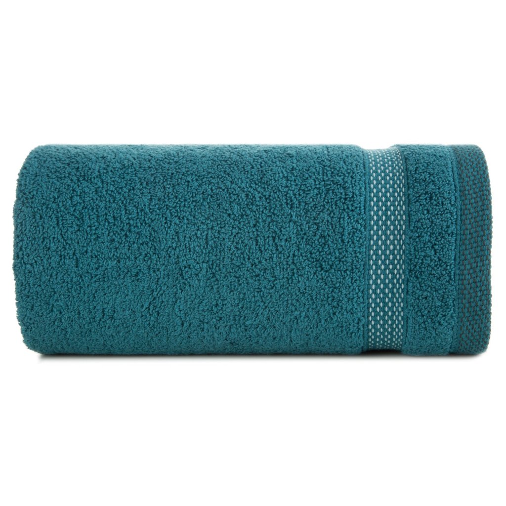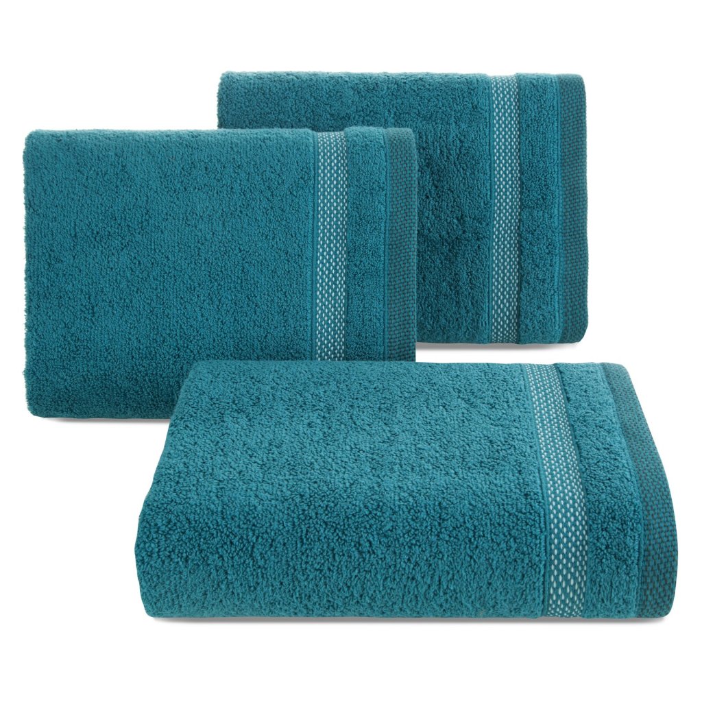 Ručník s froté bavlněnou strukturou klasického charakteru zdobený elegantním pruhovaným lemem s lesklými nitěmi. Šířka: 50 cm, délka: 90 cm, barva: modrá, gramáž: 400 GSM, složení: 100% bavlna; ozdobná část: 50% bavlna, 50% polyester.Doplňkové parametry