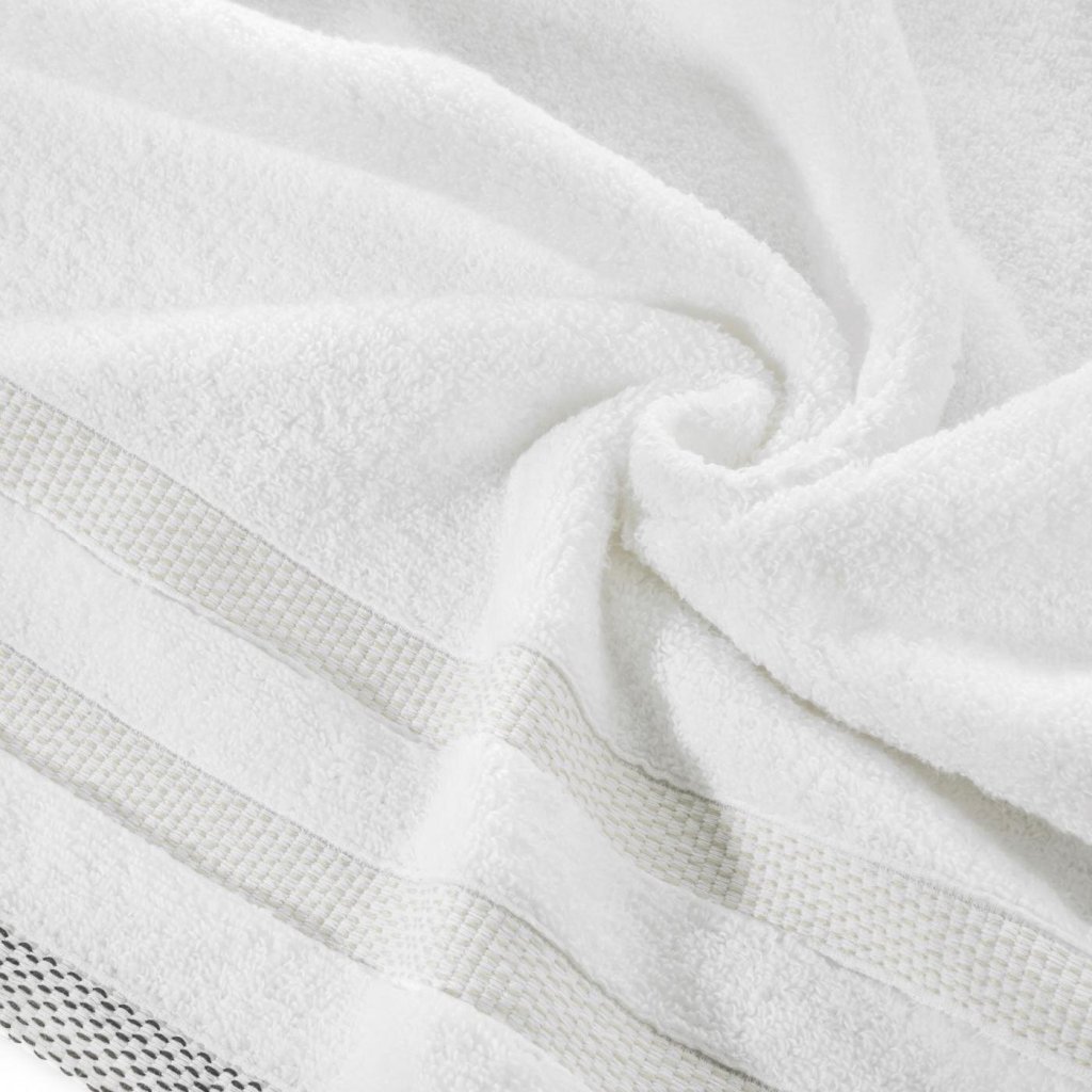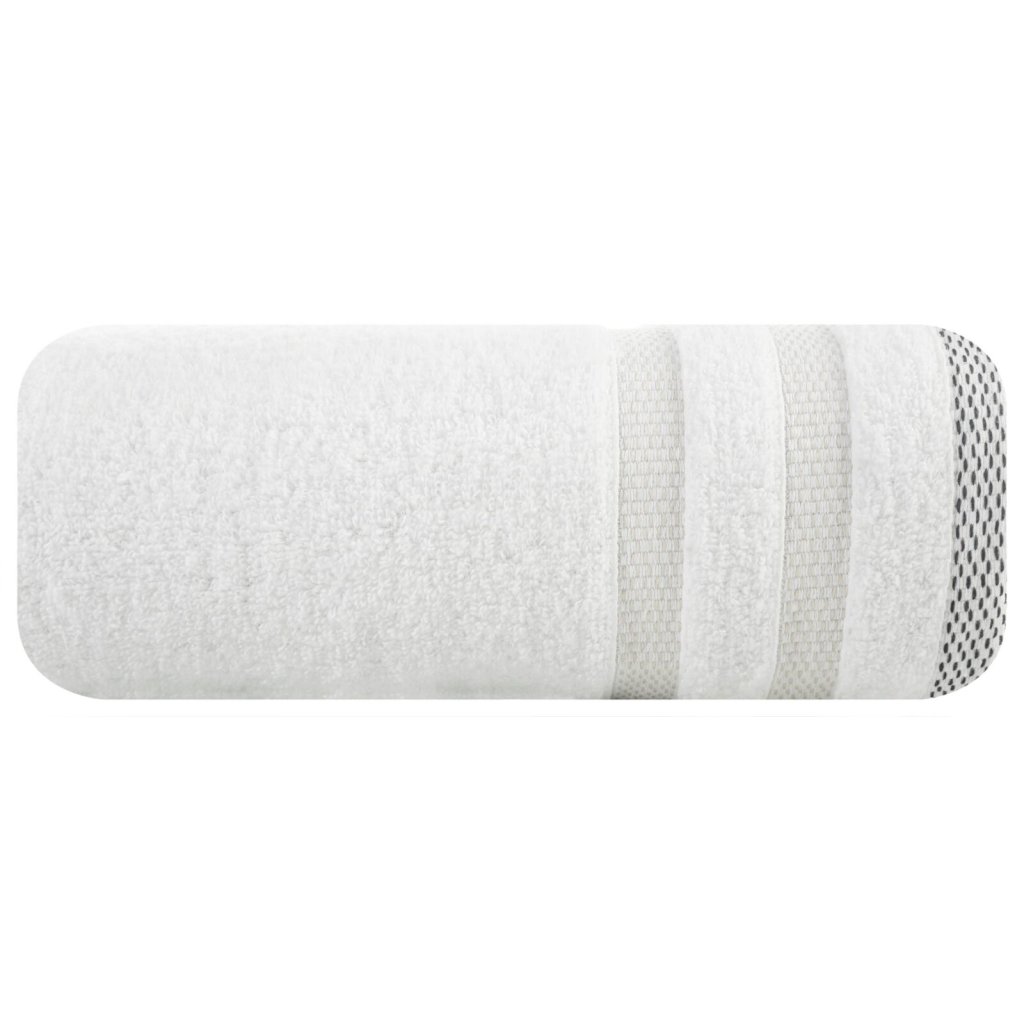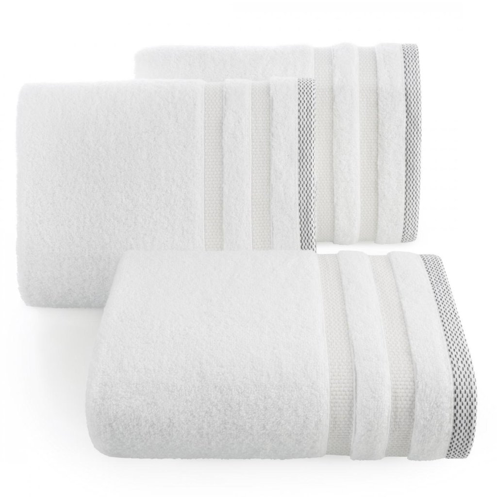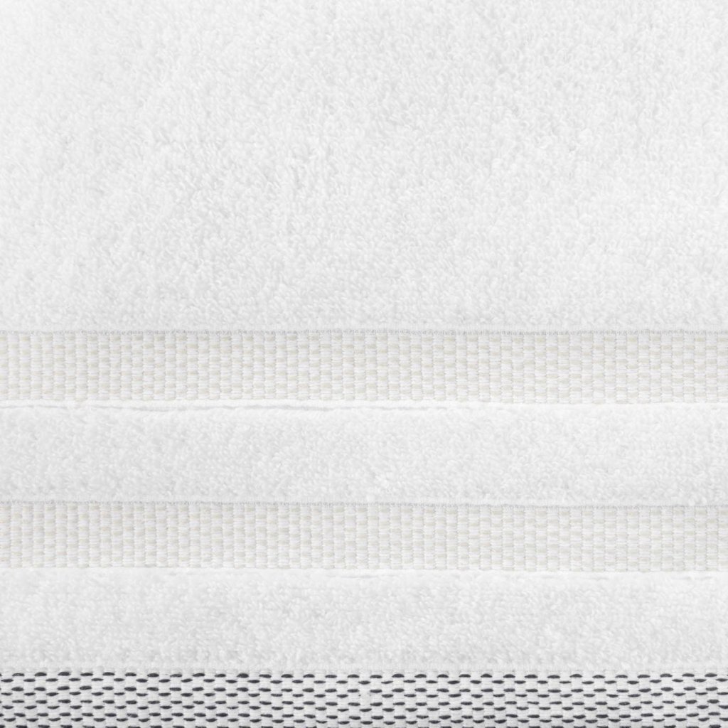 Ručník s froté bavlněnou strukturou klasického charakteru zdobený elegantním pruhovaným lemem s lesklými nitěmi. Šířka: 70 cm, délka: 140 cm, barva: bílá, gramáž: 400 GSM, složení: 100% bavlna; ozdobná část: 50% bavlna, 50% polyester.Doplňkové parametry