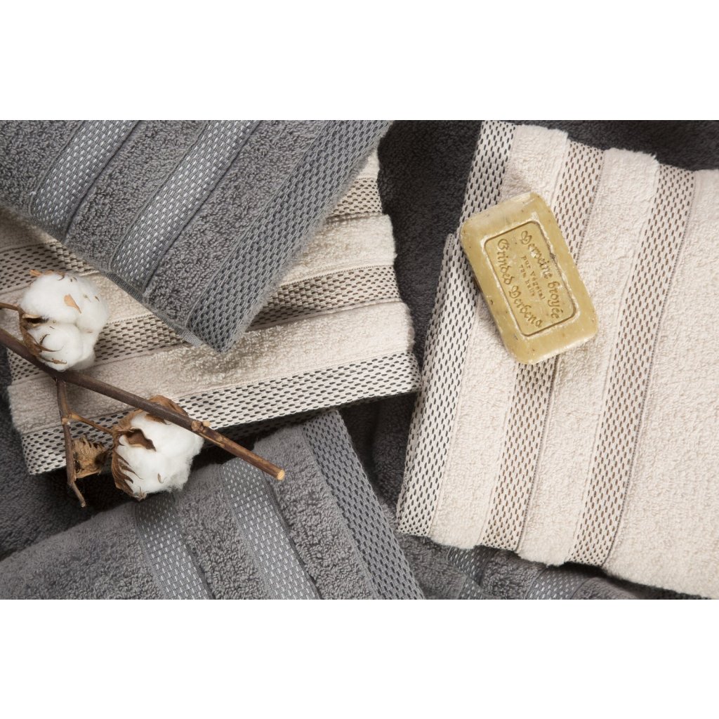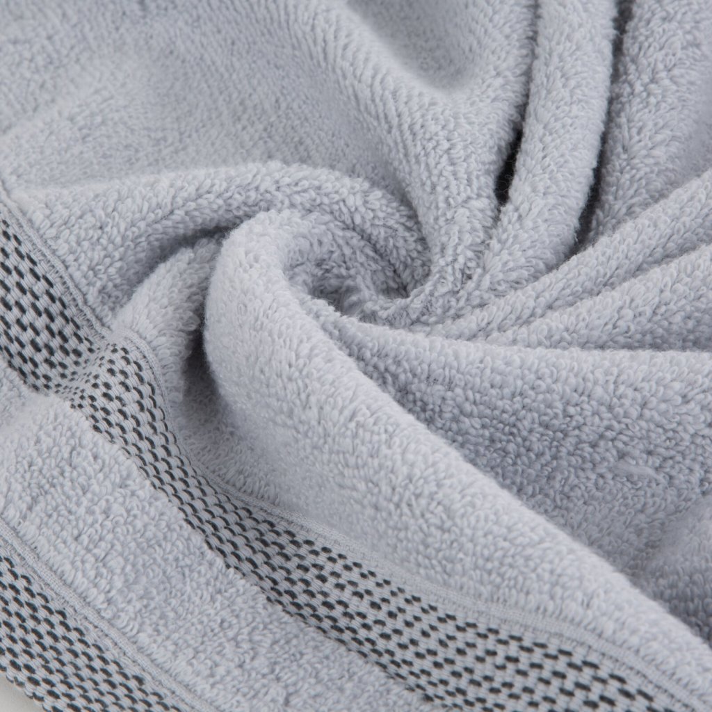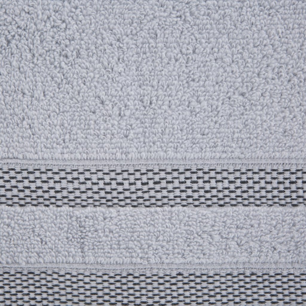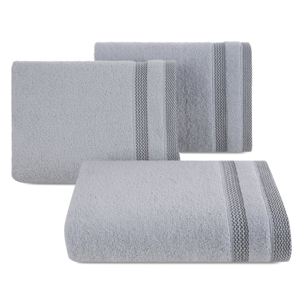 Ručník s froté bavlněnou strukturou klasického charakteru zdobený elegantním pruhovaným lemem s lesklými nitěmi. Šířka: 70 cm, délka: 140 cm, barva: stříbrná, gramáž: 400 GSM, složení: 100% bavlna; ozdobná část: 50% bavlna, 50% polyester.Doplňkové parametry