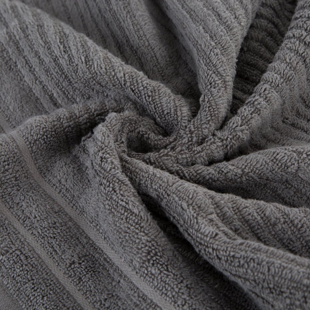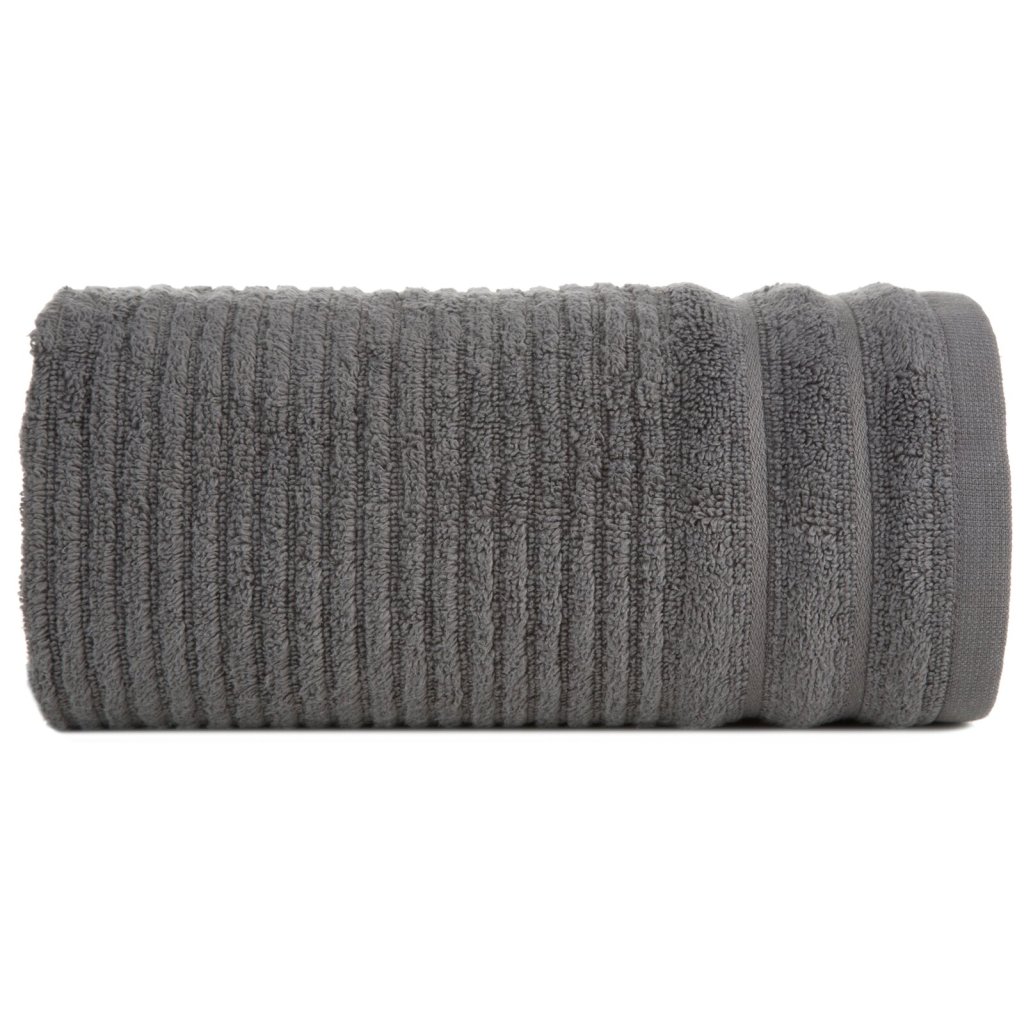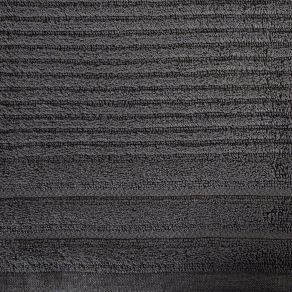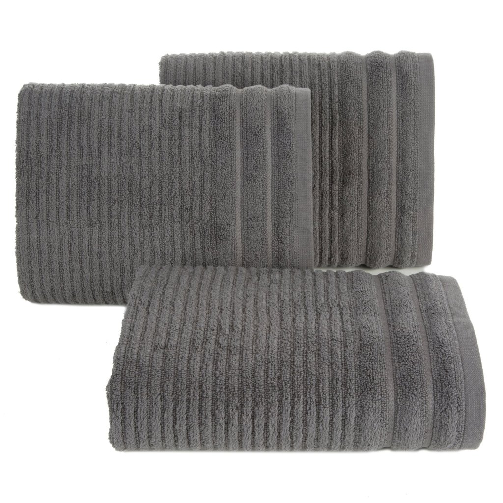Ručník z měkké a savé bavlněné tkaniny s froté vazbou, zdobený barevným lemem ve stylu bastingu. Šířka: 30 cm, délka: 50 cm, barva: tmavě šedá, gramáž: 400 GSM, složení: 100% bavlna.Doplňkové parametry