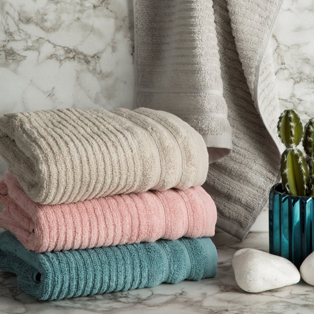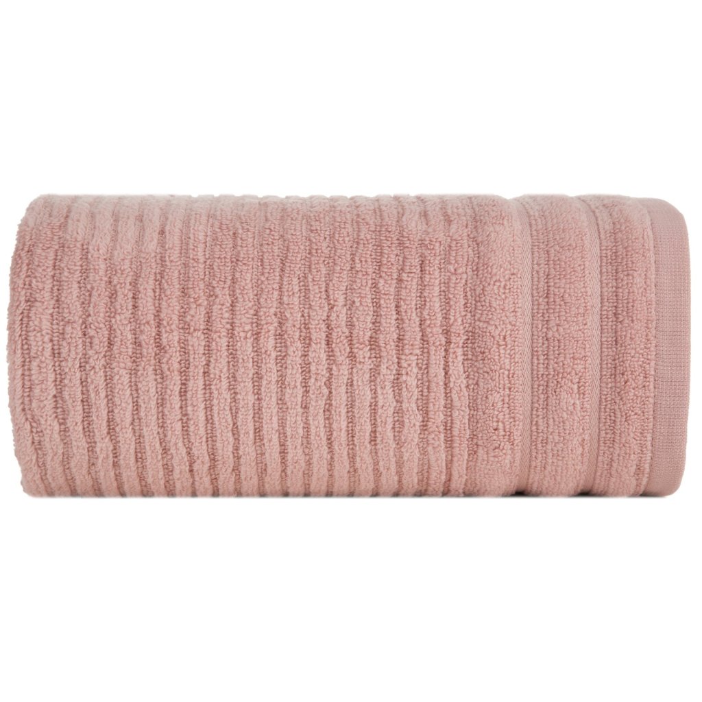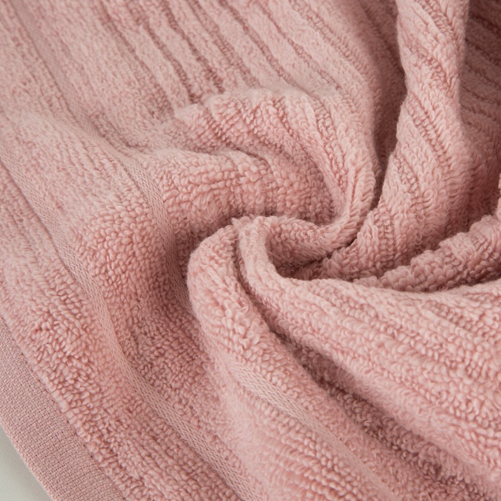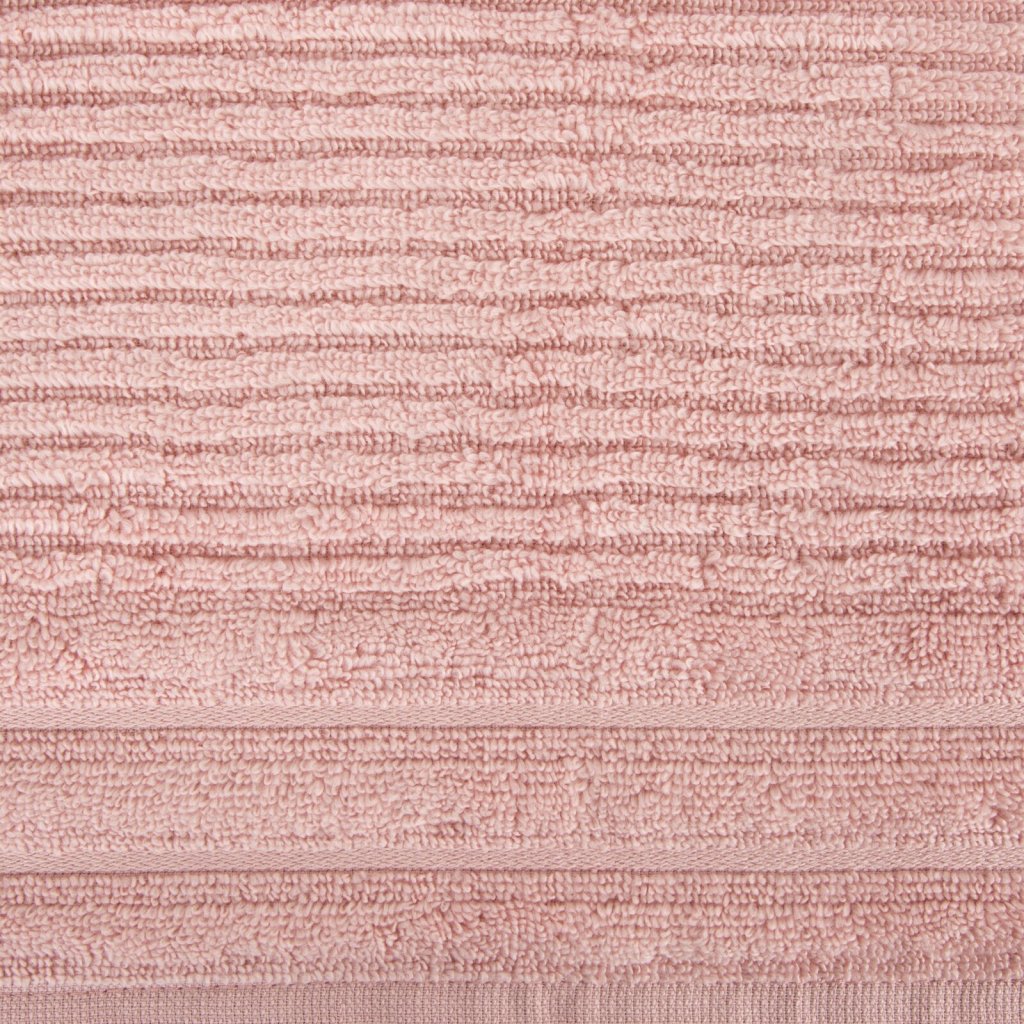 Ručník z měkké a savé bavlněné tkaniny s froté vazbou, zdobený barevným lemem ve stylu bastingu. Šířka: 30 cm, délka: 50 cm, barva: pudrová, gramáž: 400 GSM, složení: 100% bavlna.Doplňkové parametry