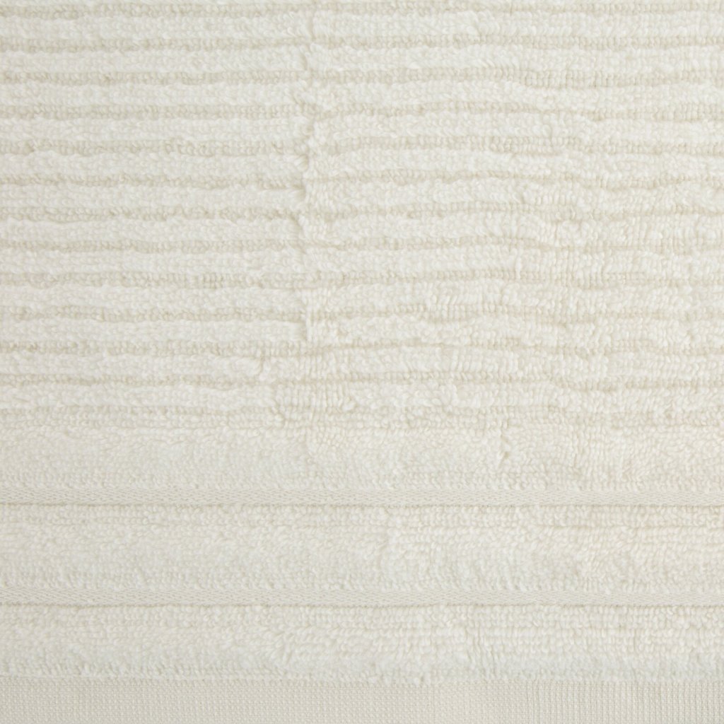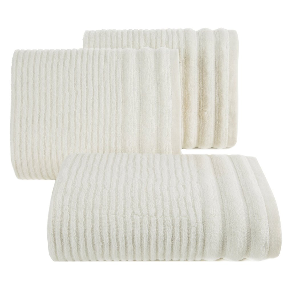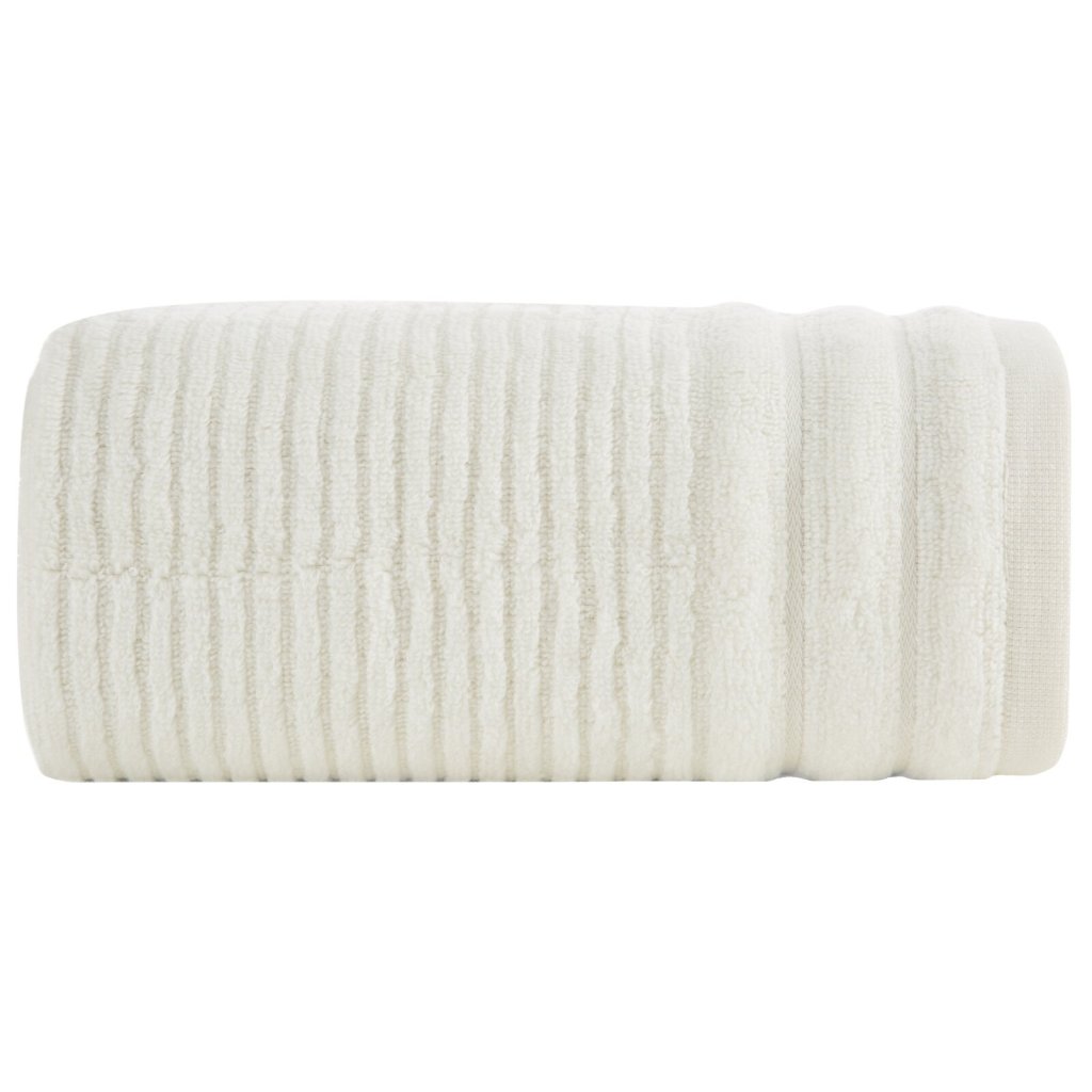 Ručník z měkké a savé bavlněné tkaniny s froté vazbou, zdobený barevným lemem ve stylu bastingu. Šířka: 70 cm, délka: 140 cm, barva: krémová, gramáž: 400 GSM, složení: 100% bavlna.Doplňkové parametry