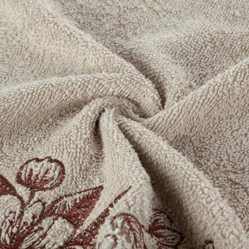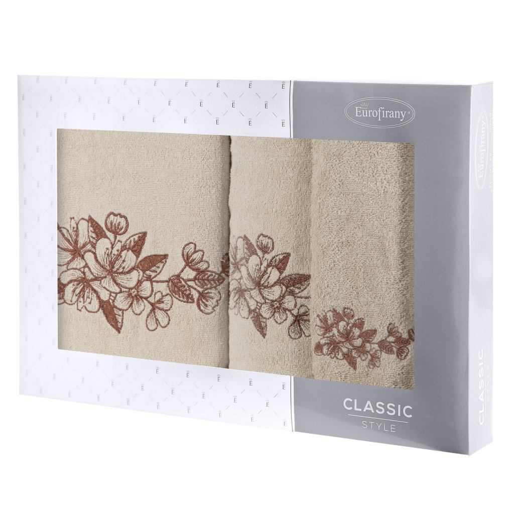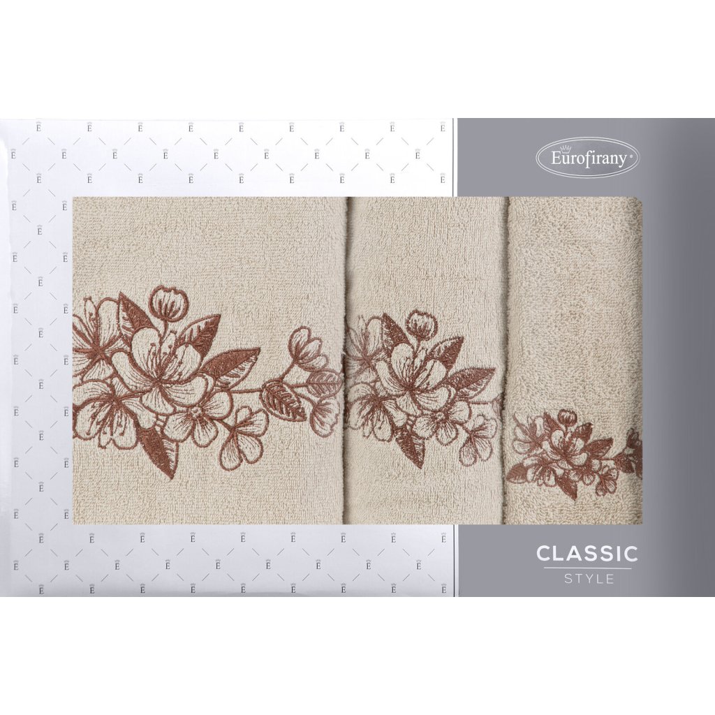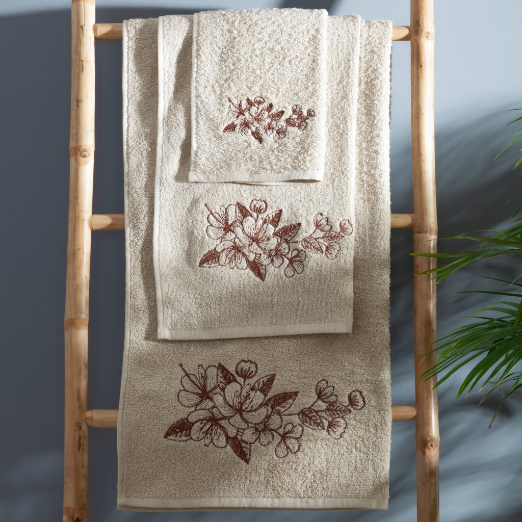 Elegantní sada ručníků MOLI s jemnou výšivkou třešňových květů je ideální volbou. Je vyrobena ze 100% bavlněného froté s certifikací OEKO-TEX® Standard 100. Ručníky vynikají měkkostí a vysokou savostí. Jemná výšivka a estetické balení v kartonové krabici činí z této sady originální dárek. Sada obsahuje 3 ks ručníků o rozměrech: 70x140 cm - 1 ks, 50x90 cm - 1 ks, 30x50 cm - 1 ks , barva: béžová, gramáž: 400 GSM, složení: 100% bavlna.Doplňkové parametry