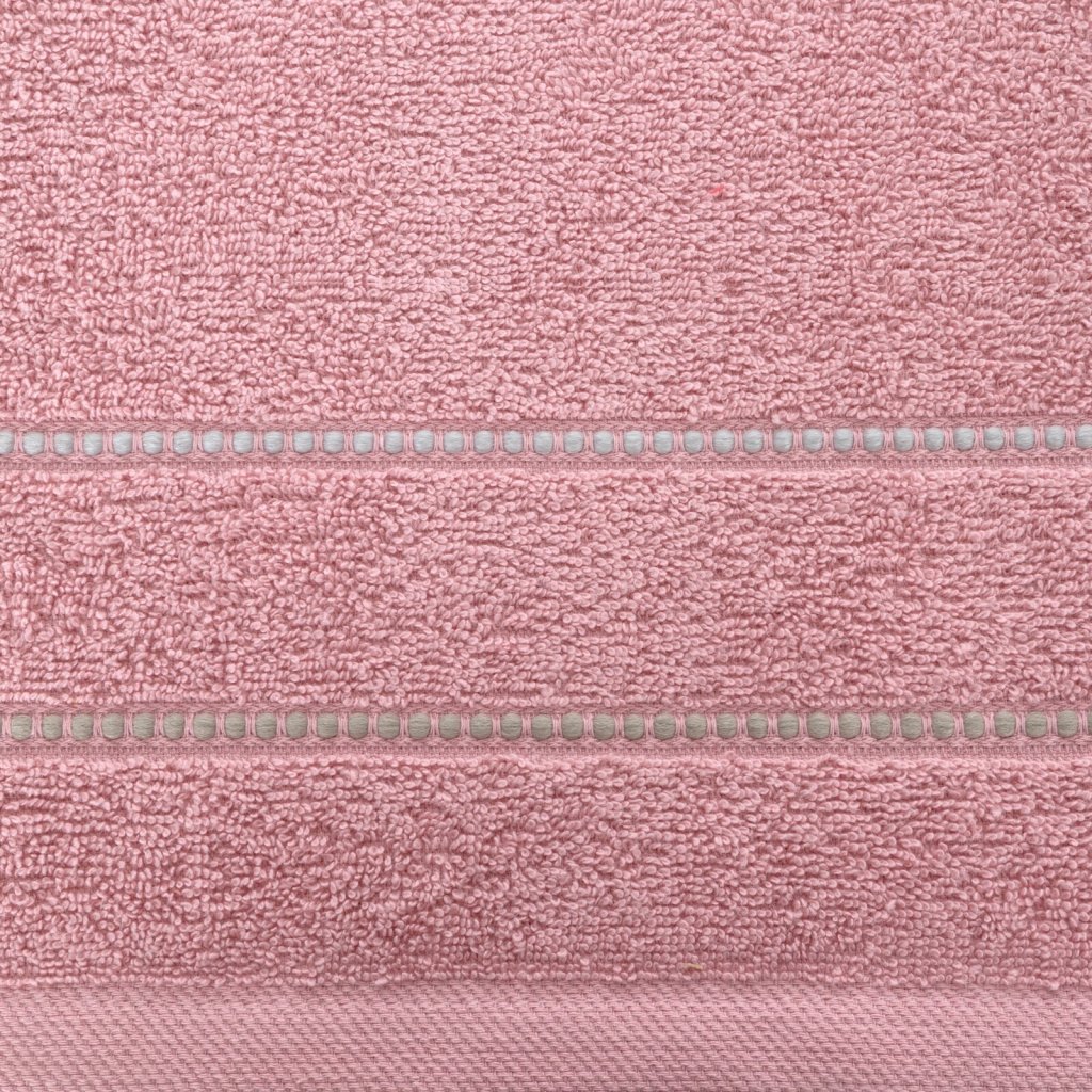 Ručník z měkké a savé bavlněné tkaniny s froté vazbou, zdobený barevným lemem ve stylu bastingu. Šířka: 30 cm, délka: 50 cm, barva: amarant, gramáž: 500 GSM, složení: 100% bavlna; ozdobná část: 50% bavlna, 50% polyester.Doplňkové parametry