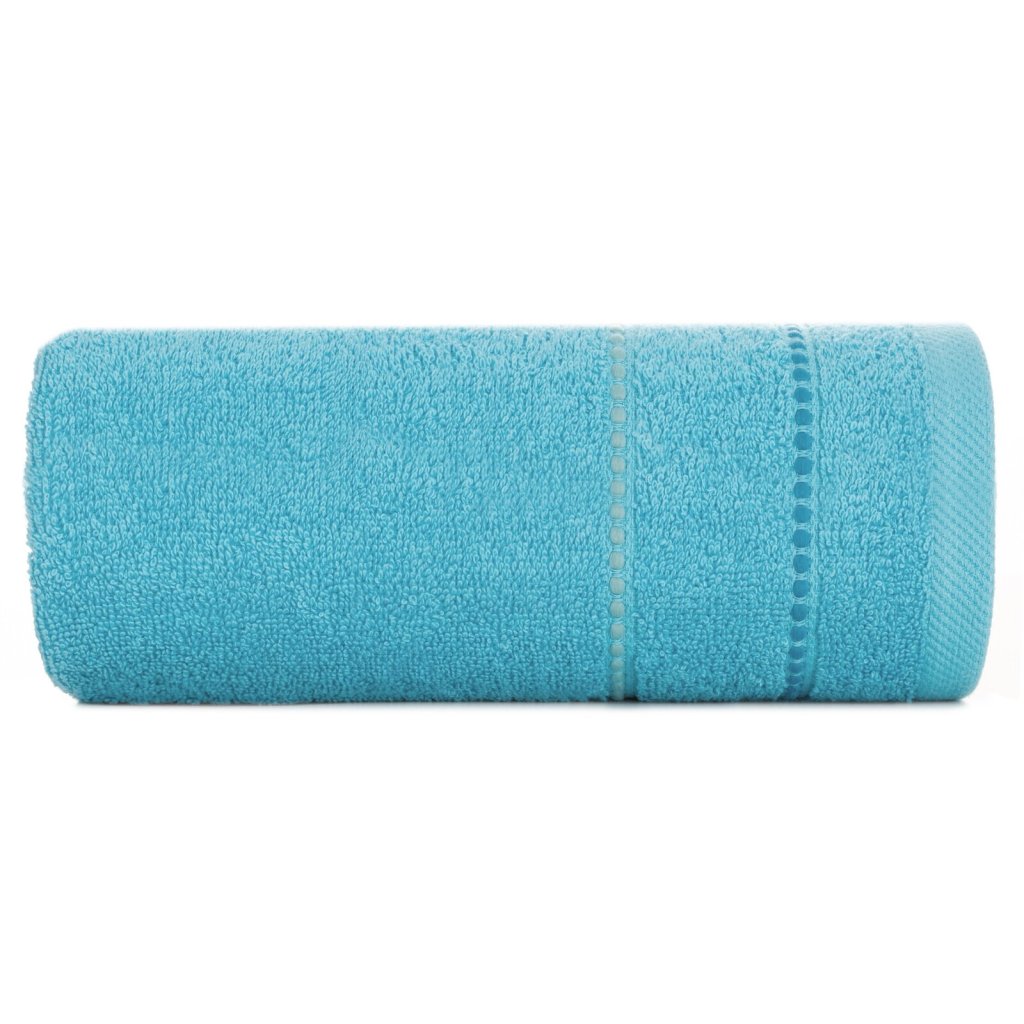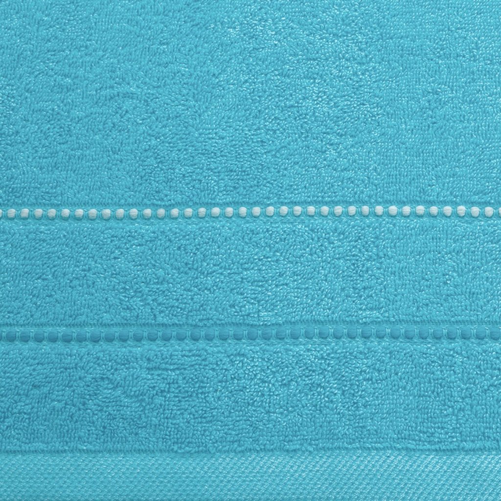Ručník z měkké a savé bavlněné tkaniny s froté vazbou, zdobený barevným lemem ve stylu bastingu. Šířka: 30 cm, délka: 50 cm, barva: světle modrá, hmotnost: 500 GSM, složení: 100 % bavlna; ozdobná část: 50 % bavlna, 50 % polyester.Doplňkové parametry