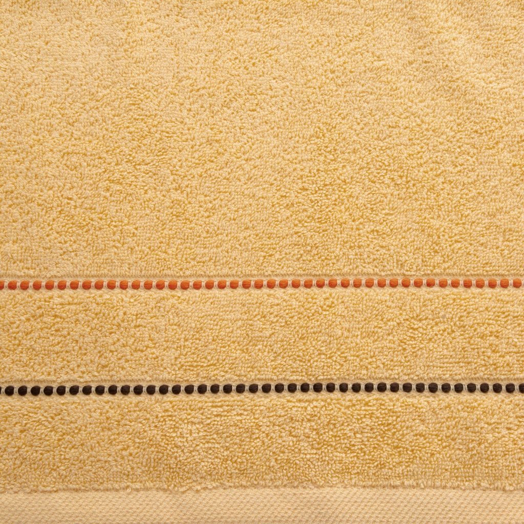 Ručník z měkké a savé bavlněné tkaniny s froté vazbou, zdobený barevným lemem ve stylu bastingu. Šířka: 30 cm, délka: 50 cm, barva: světle oranžová, gramáž: 500 GSM, složení: 100% bavlna; ozdobná část: 50% bavlna, 50% polyester.Doplňkové parametry