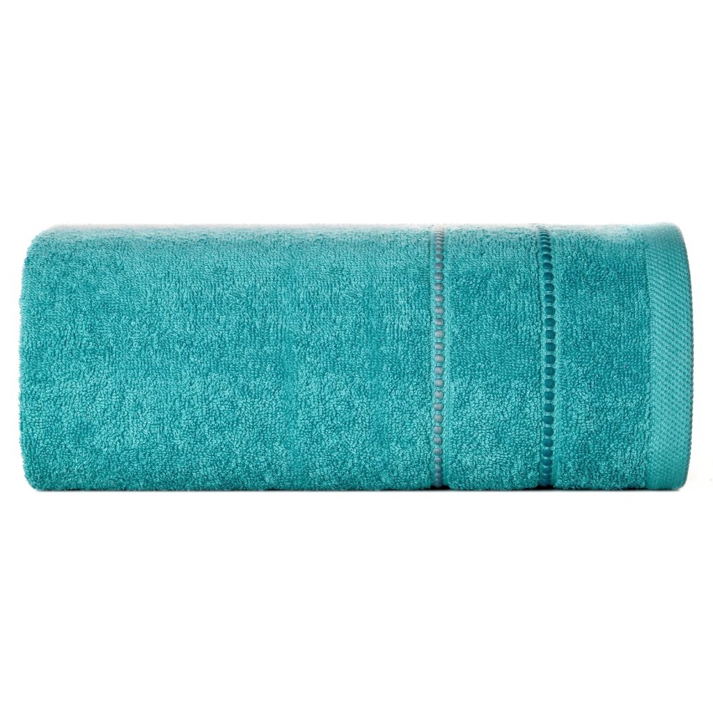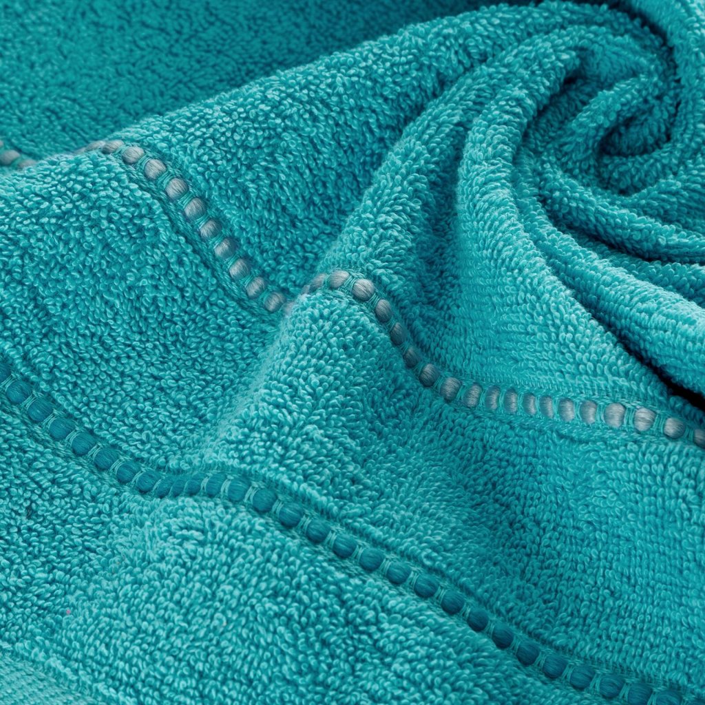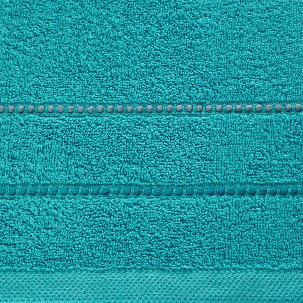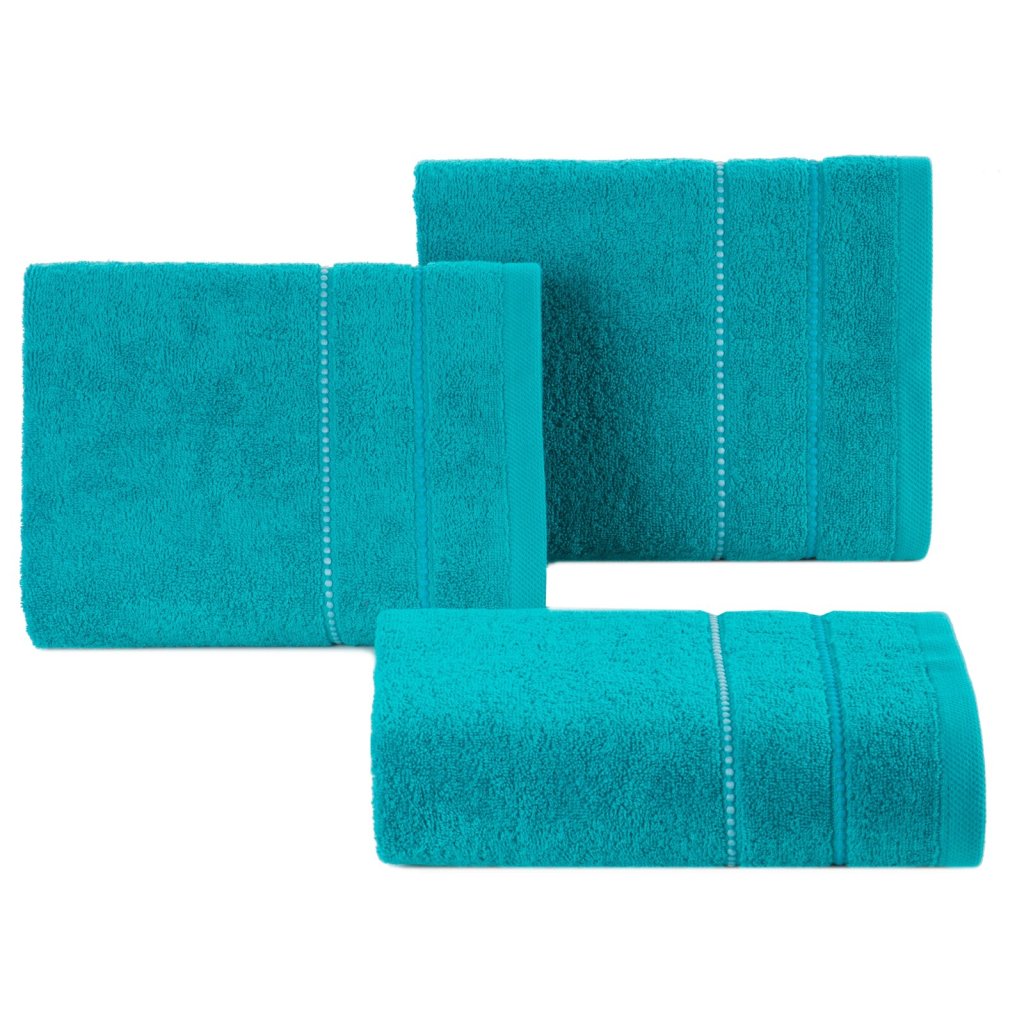 Ručník z měkké a savé bavlněné tkaniny s froté vazbou, zdobený barevným lemem ve stylu bastingu. Šířka: 30 cm, délka: 50 cm, barva: tyrkysová, gramáž: 500 GSM, složení: 100% bavlna; ozdobná část: 50% bavlna, 50% polyester.Doplňkové parametry