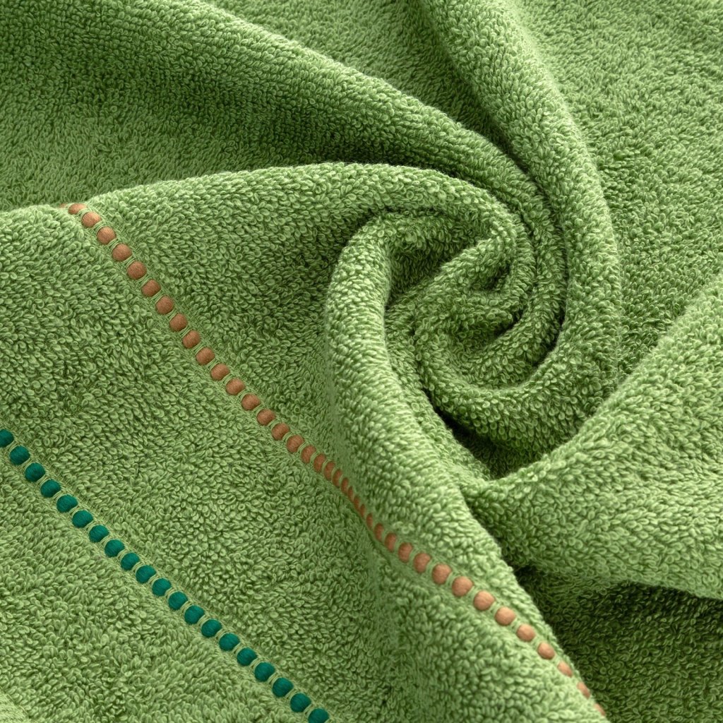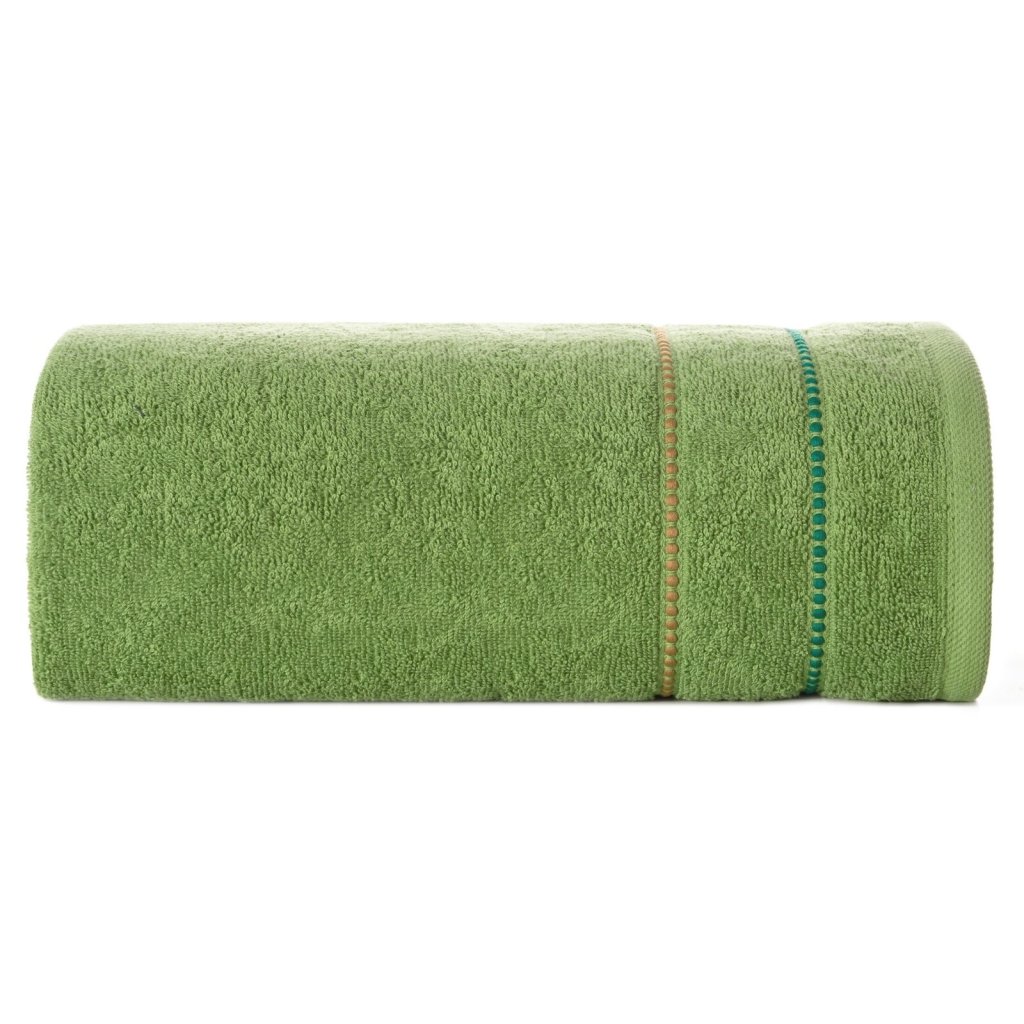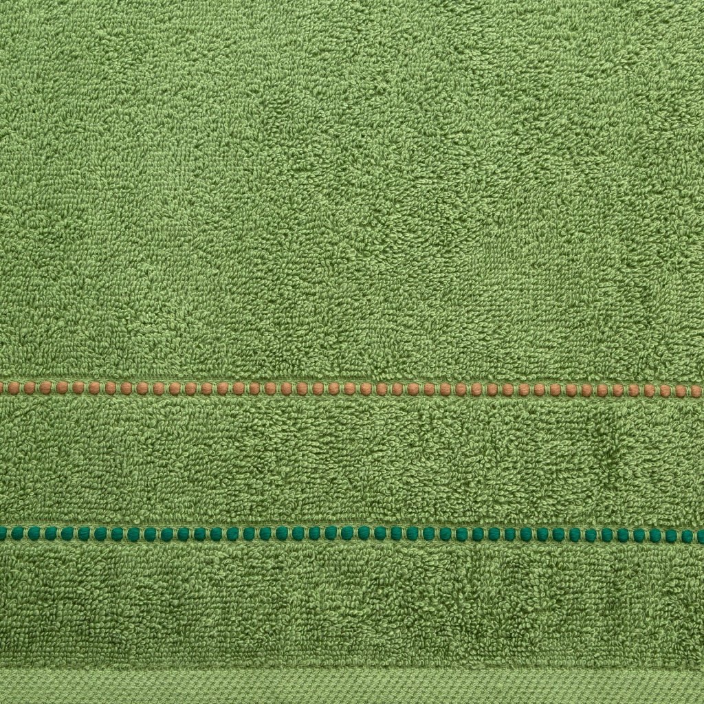 Ručník z měkké a savé bavlněné tkaniny s froté vazbou, zdobený barevným lemem ve stylu bastingu. Šířka: 30 cm, délka: 50 cm, barva: zelená, gramáž: 500 GSM, složení: 100% bavlna; ozdobná část: 50% bavlna, 50% polyester.Doplňkové parametry