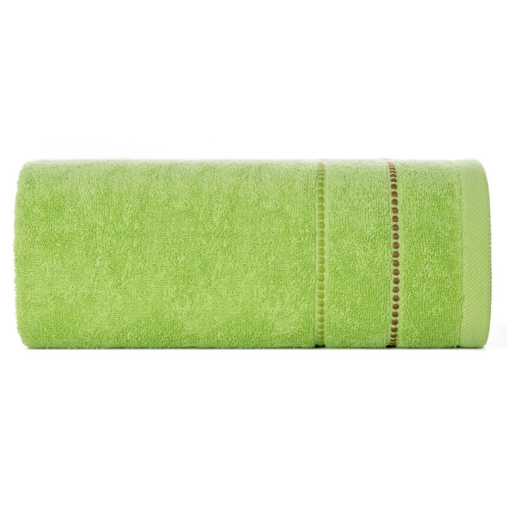 Ručník z měkké a savé bavlněné tkaniny s froté vazbou, zdobený barevným lemem ve stylu bastingu. Šířka: 50 cm, délka: 90 cm, barva: světle zelená, hmotnost: 500 GSM, složení: 100 % bavlna; ozdobná část: 50 % bavlna, 50 % polyester.Doplňkové parametry
