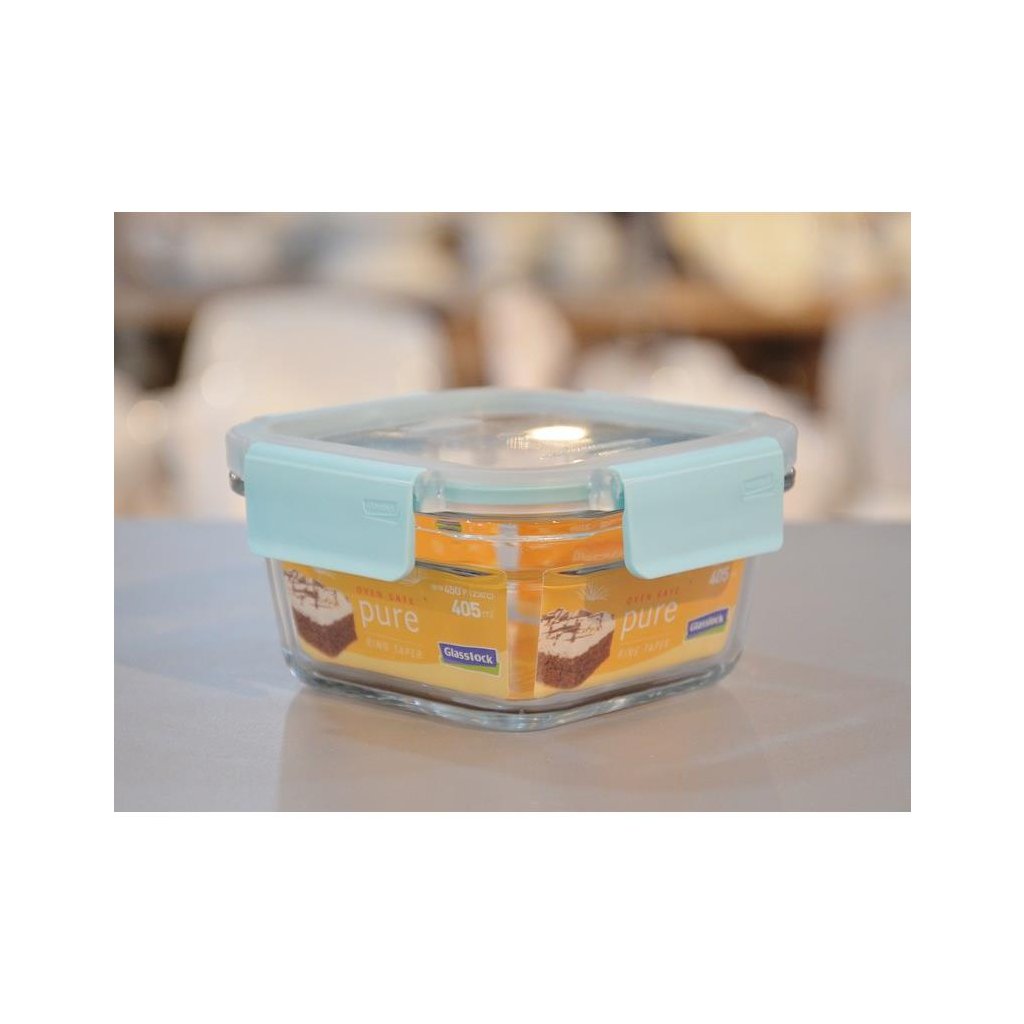 Čtvercová skleněná dóza s modrým plastovým nacvakávacím víčkem a těsněním je vyrobena z kvalitního tvrzeného skla. Speciální silikonové těsnění zajišťuje naprostou vzduchotěsnost a udržuje vůni potravin uvnitř nádoby. Omezené množství kyslíku v uzavřené nádobě znamená, že skladovaný produkt zůstane mnohem déle čerstvý. Skleněná nádoba slouží především ke skladování potravin (nádoby jsou navrženy tak, aby se hodily do každé kuchyně, a umožňují lepší organizaci - prázdné nádoby lze stohovat a plné stohovat) nebo jako svačinový box do práce - díky těsnění se polévka nebo omáčka nevylije např. při přenášení v tašce nebo při přepravě. Skleněná nádoba je šetrná k životnímu prostředí (recyklovatelná) a uživatelsky přívětivá (neobsahuje bisfenol A - BPA a estrogen). Skleněná nádoba je vhodná pro použití v troubě - na pečení, zapékání, dušení pokrmů (bez víka).Skleněná nádoba na uchovávání potravin a pečení v troubě, s plastovým víkem a těsněním - hranatá