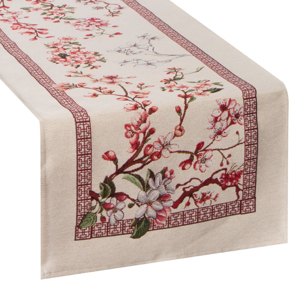 Vneste do svého domova svěžest jara s ubrusem, který zaujme jemným motivem rozkvetlých větviček sakury. Světle béžový základ zdobí růžové, červené a bílé květy v kombinaci se zelenými listy, které vytvářejí romantickou a harmonickou atmosféru. Ozdobný okraj v odstínech vínově červené dodává ubrusu stylový a zároveň tradiční nádech. Šířka: 45 cm, délka: 140 cm, barva: vícebarevná, hmotnost: 350 GSM, složení: 60 % bavlna, 40 % polyester.Doplňkové parametry