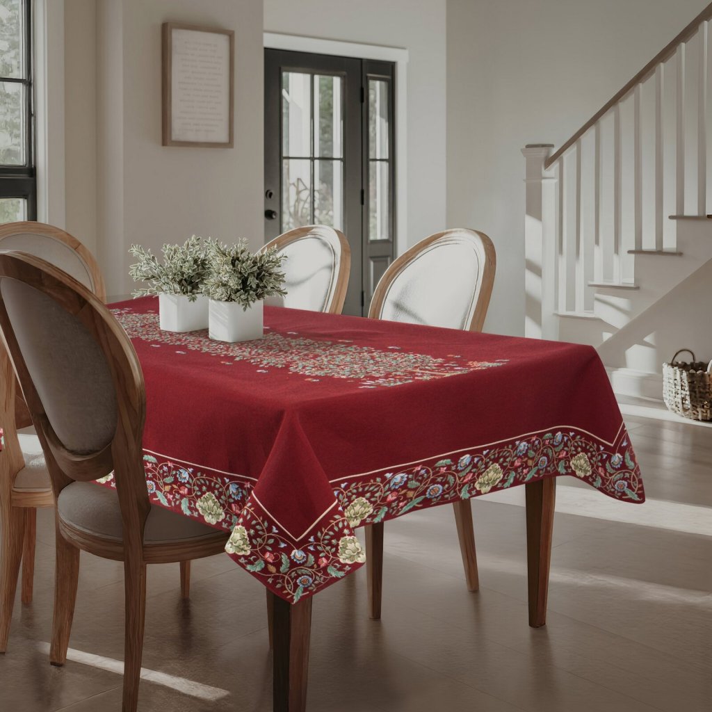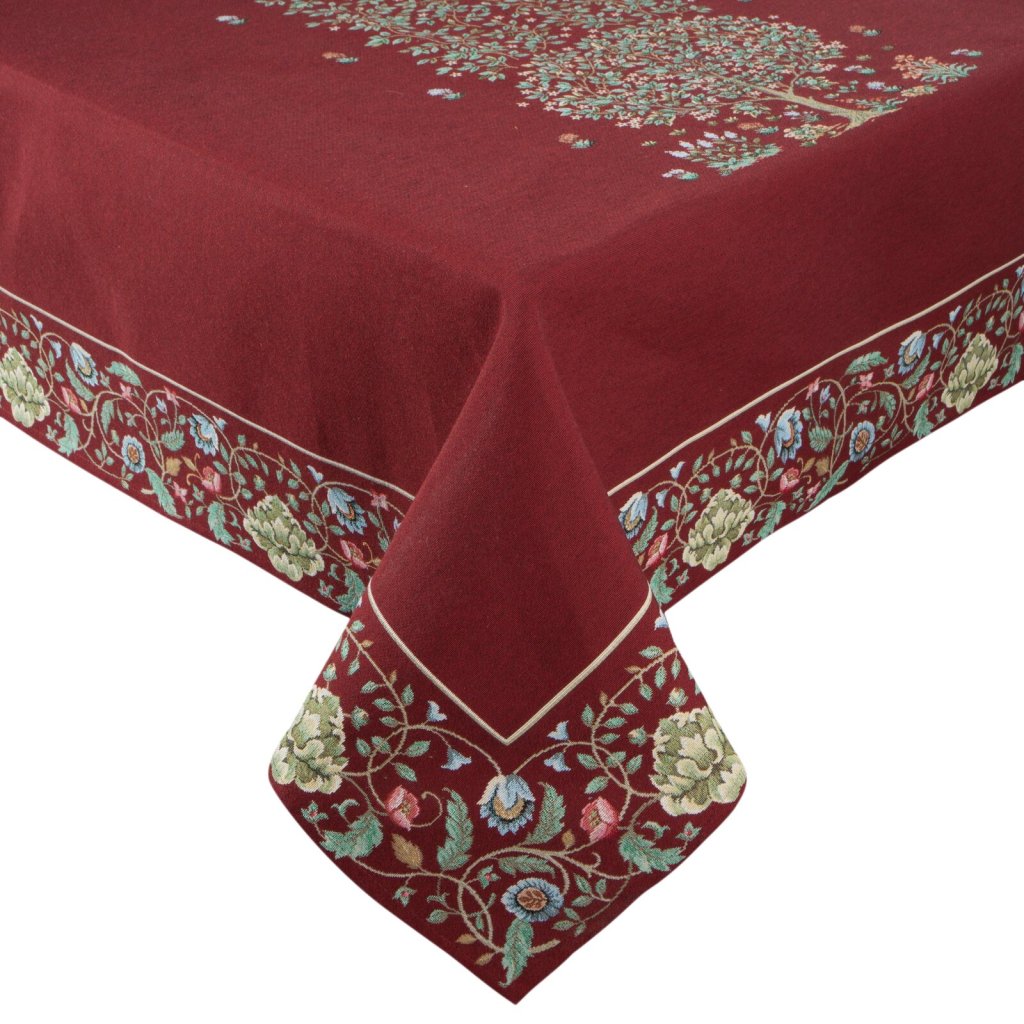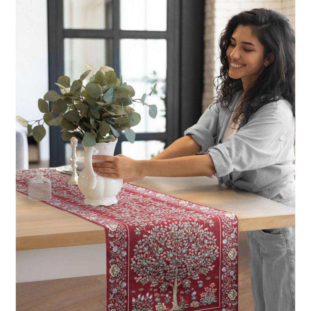 Vneste do svého domova rafinovanost s gobelínovým ubrusem Festive Verde v červené barvě. Bohatý vzor se stromem života a jemnými květinovými detaily působí tradičně a elegantně zároveň. Díky vysoké gramáži a kvalitnímu složení polyesteru a bavlny je běhoun odolný, rozměrově stálý a příjemný na dotek. Šířka: 140 cm, délka: 180 cm, barva: vícebarevná, gramáž: 400 GSM, složení: 68 % polyester, 32 % bavlna.Doplňkové parametry