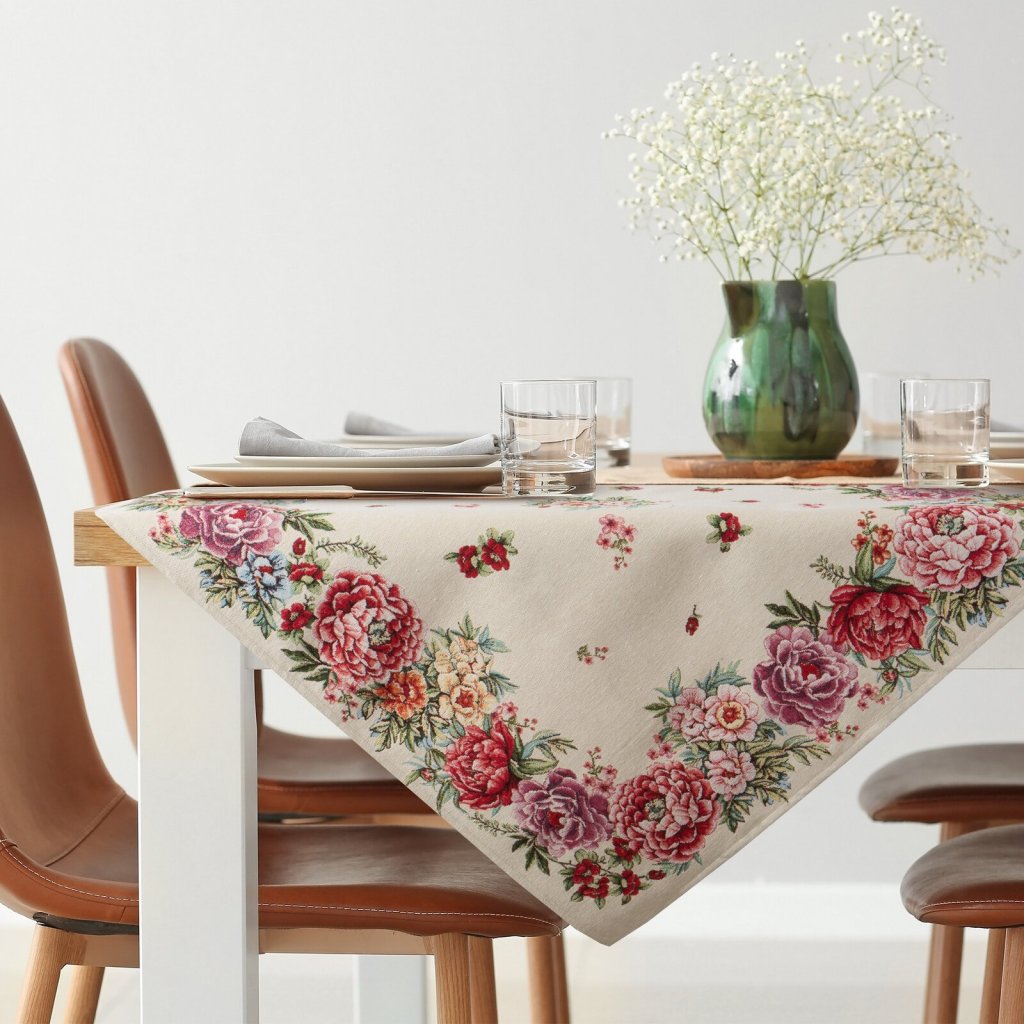 Elegantní gobelínový ubrus GRIA s květinovým motivem dodá vaší jídelně šarm. Ubrus je vyroben z odolné směsi bavlněných a polyesterových vláken a kombinuje přírodní vzhled s pevností a odolností, která vydrží každodenní používání. Květinový vzor plný jemných detailů dodá úpravě stolu svěžest, jemnou barevnost a nadčasový šarm. Šířka: 100 cm, délka: 100 cm, barva: vícebarevná, hmotnost: 350 GSM, složení: 60 % bavlna, 40 % polyester.Doplňkové parametry