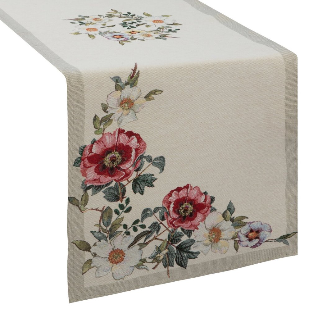 Gobelínový ubrus s květinovým vzorem, šířka: 45 cm, délka: 140 cm, barva: vícebarevná, hmotnost: 410 GSM, složení: 75 % polyester, 22 % bavlna, 3 % akryl.Doplňkové parametry