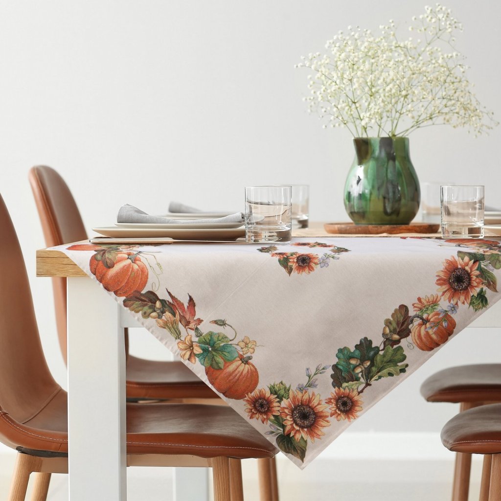 Vytvořte ve svém interiéru hřejivou a útulnou atmosféru s gobelínovým ubrusem PUMPKIN zdobeným půvabným motivem slunečnic a dýní. Tato jedinečná stolní dekorace z vysoce kvalitní směsi bavlny a polyesteru potěší bohatým designem inspirovaným přírodou a barvami pozdního léta a podzimu. Šířka: 100 cm, délka: 100 cm, barva: vícebarevná, hmotnost: 400 GSM, složení: 68 % polyester, 32 % bavlna.Doplňkové parametry