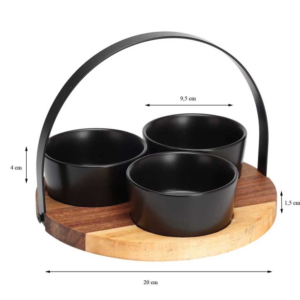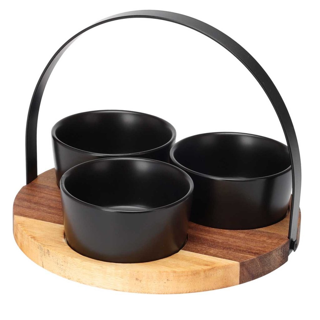 Elegantní 4-dílná servírovací sada je ideální volbou pro speciální příležitosti a každodenní setkání u stolu. Skládá se ze tří misek z odolné kameniny v matné černé barvě a podnosu z přírodního akáciového dřeva, které mu dodává luxusní a moderní vzhled. , od omáček až po lehká jídla. zaručují odolnost. Matná černá barva misek a přírodní dřevo vytvářejí moderní, estetický vzhled. – 20 cm- tloušťka podnosu – 1,5 cm