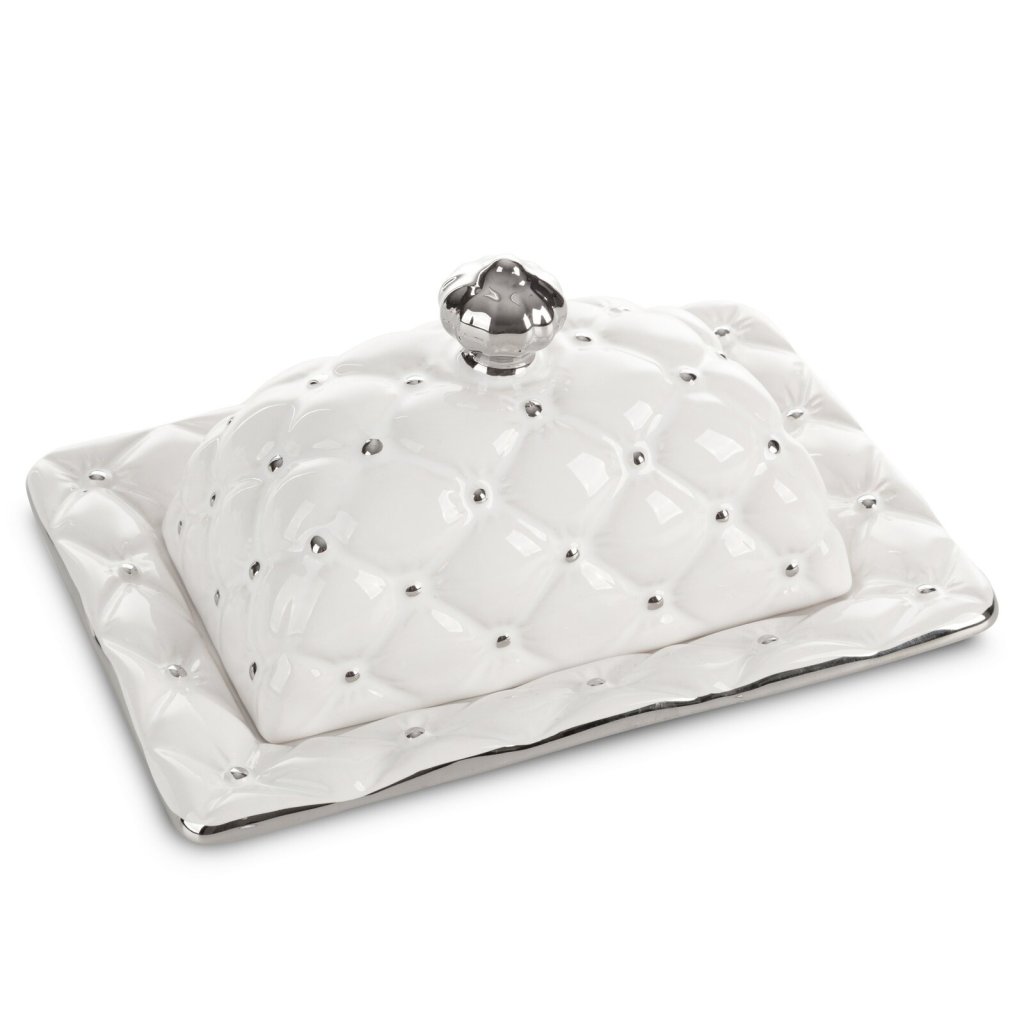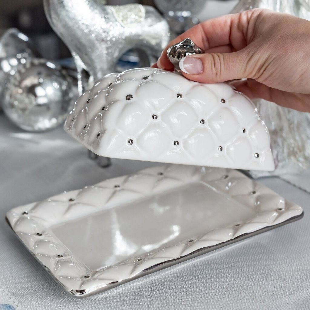 Elegantní a stylová keramická nádoba, která kombinuje funkčnost a jedinečný design. Její povrch zdobí reliéfní vzor připomínající prošívání, který nádobě dodává luxusní charakter a působivou strukturu. Drobné stříbrné akcenty jemně odrážejí světlo a vytvářejí jedinečný dekorativní akcent. Šířka: 21 cm, délka: 15 cm, barva: bílá a stříbrná, složení: keramická hlína.Doplňkové parametry