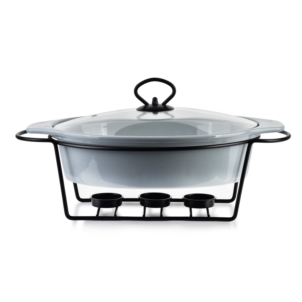 Objevte revoluci v přípravě jídla s naší odolnou nádobou s vestavěným ohřívačem! Díky této inovativní kombinaci nyní snadno udržíte ideální teplotu vašich pokrmů při jejich profesionálním podávání. Vybaveny skleněnou poklicí s otvorem pro únik páry.Čajové svíčky nejsou součástí sady.