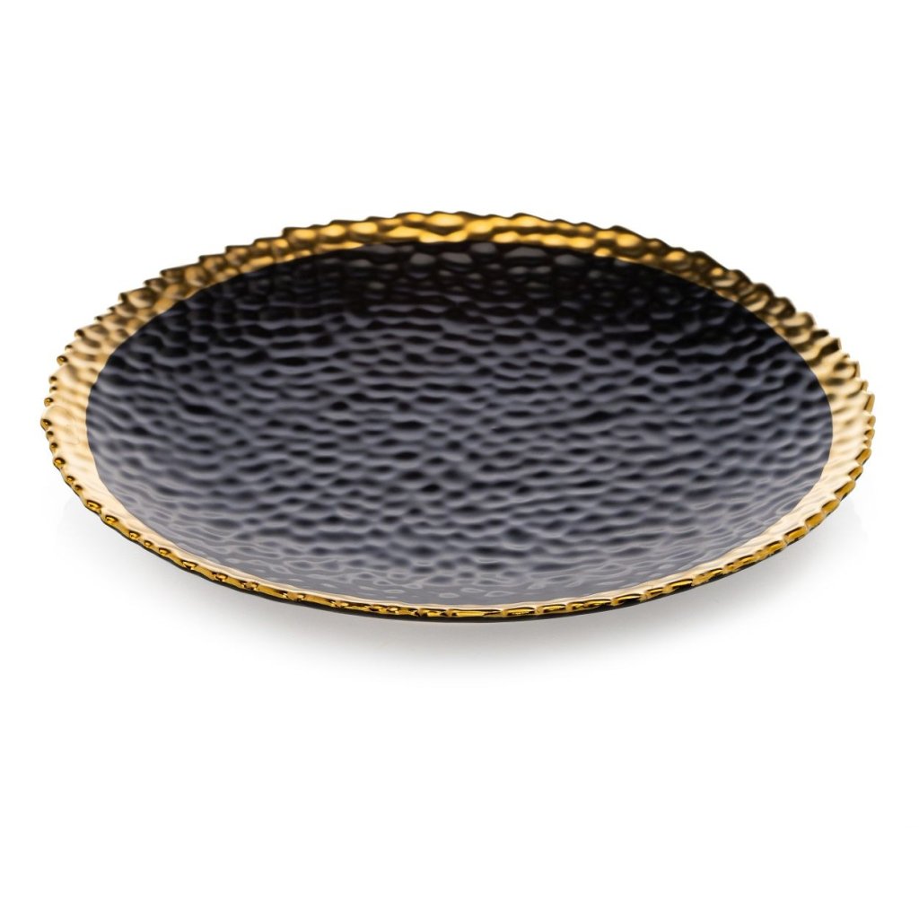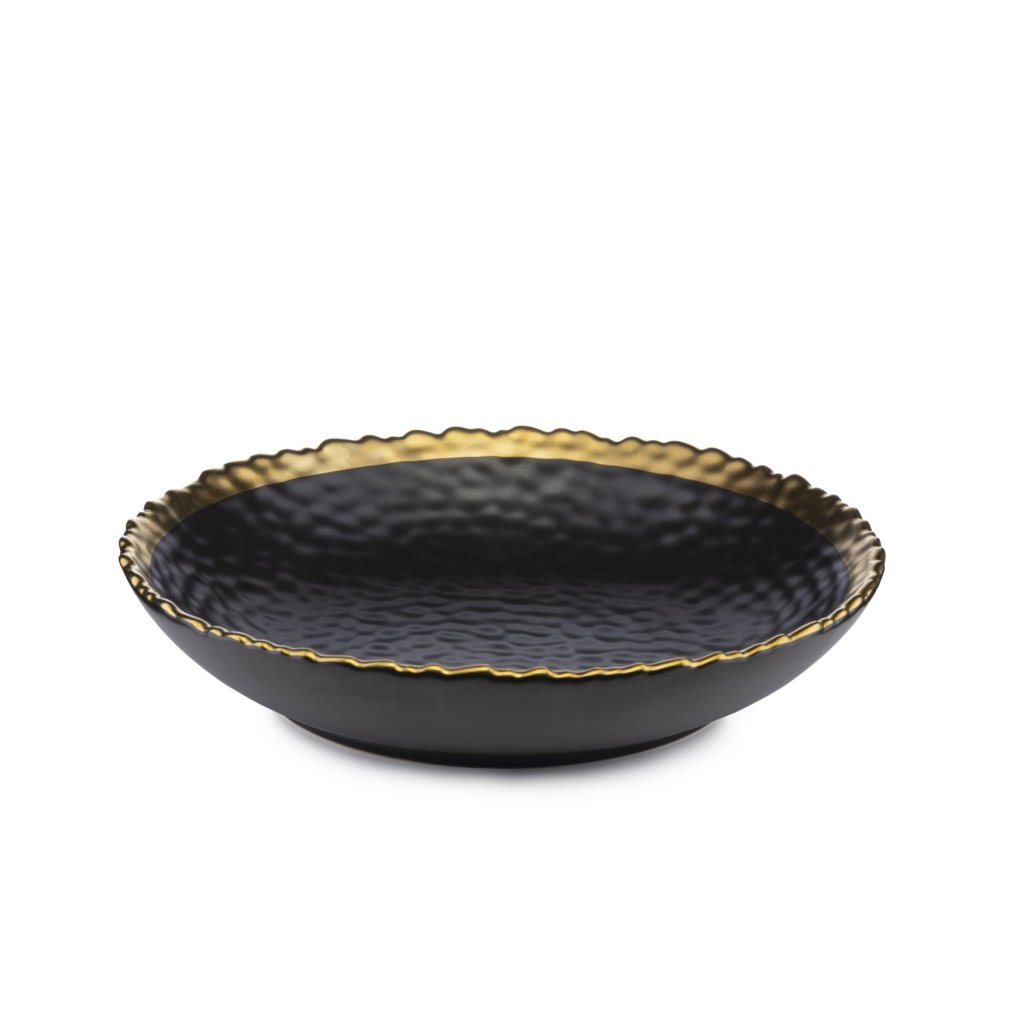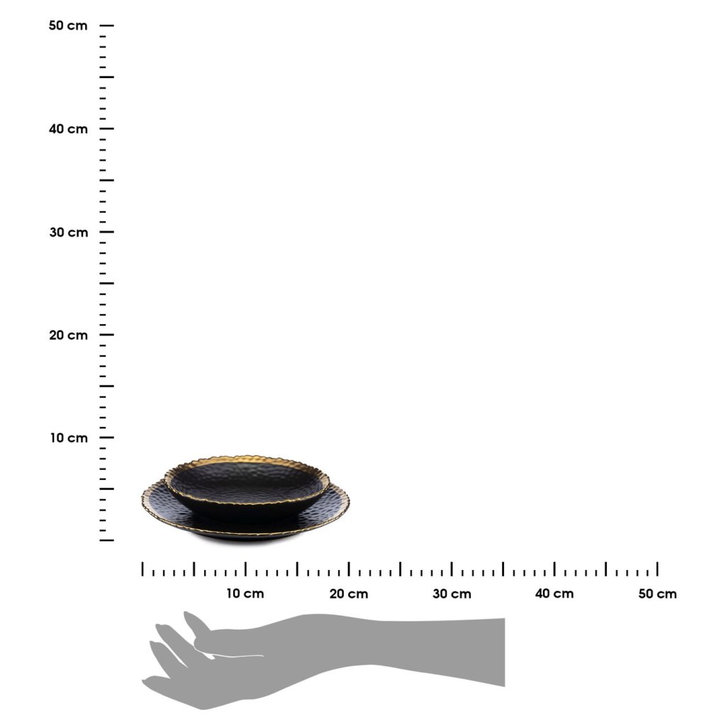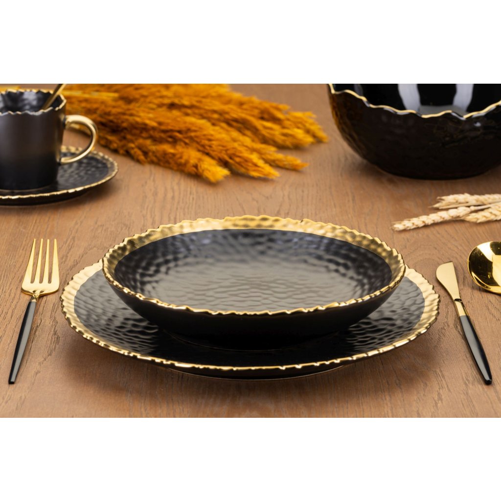 Keramická sada talířů sestávající ze 2 prvků. Stylové nádobí z kolekce KATI z černé keramiky se zlatými okraji. Nepravidelná struktura a zubaté okraje dodávají styl a modernost. Jedinečný design zapadne do glamour interiérů. Dokonale se bude hodit jak k elegantní večeři, tak ke každodenním jídlům. Talíř má vyšší okraj, díky čemuž se pohodlně používá.Nádoby se neměly mýt v myčce na nádobí. 1 x hluboký talíř: (fi) 21 cm