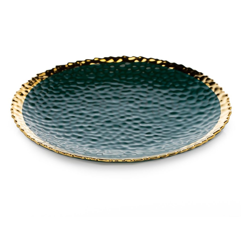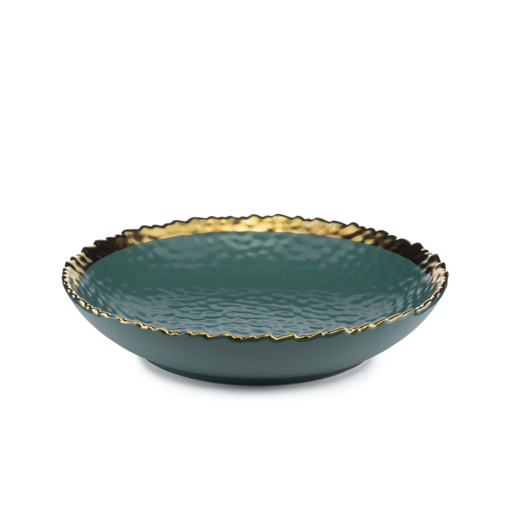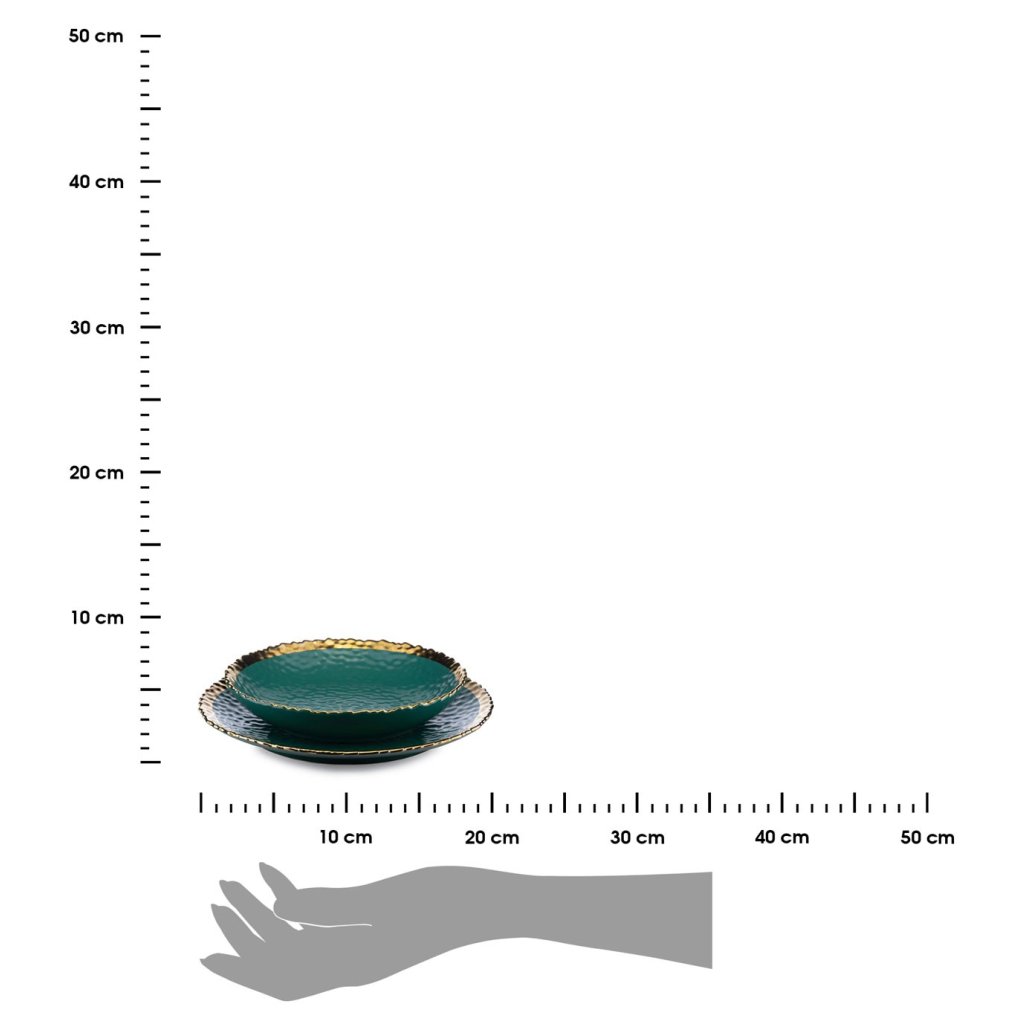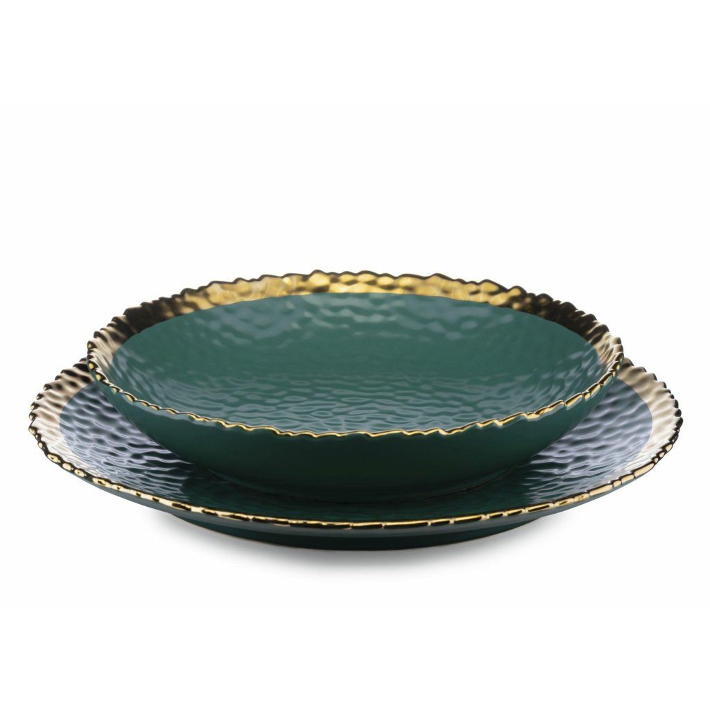 Keramická sada talířů sestávající z 8 prvků. Stylové nádobí z kolekce KATI ze zelené keramiky se zlatými okraji. Nepravidelná struktura a zubaté okraje dodávají styl a modernost. Jedinečný design zapadne do glamour interiérů. Dokonale se bude hodit jak k elegantní večeři, tak ke každodenním jídlům. Talíř má vyšší okraj, díky čemuž se pohodlně používá.Nádoby se neměly mýt v myčce na nádobí. 4 x hluboký talíř: (fi) 21 cm