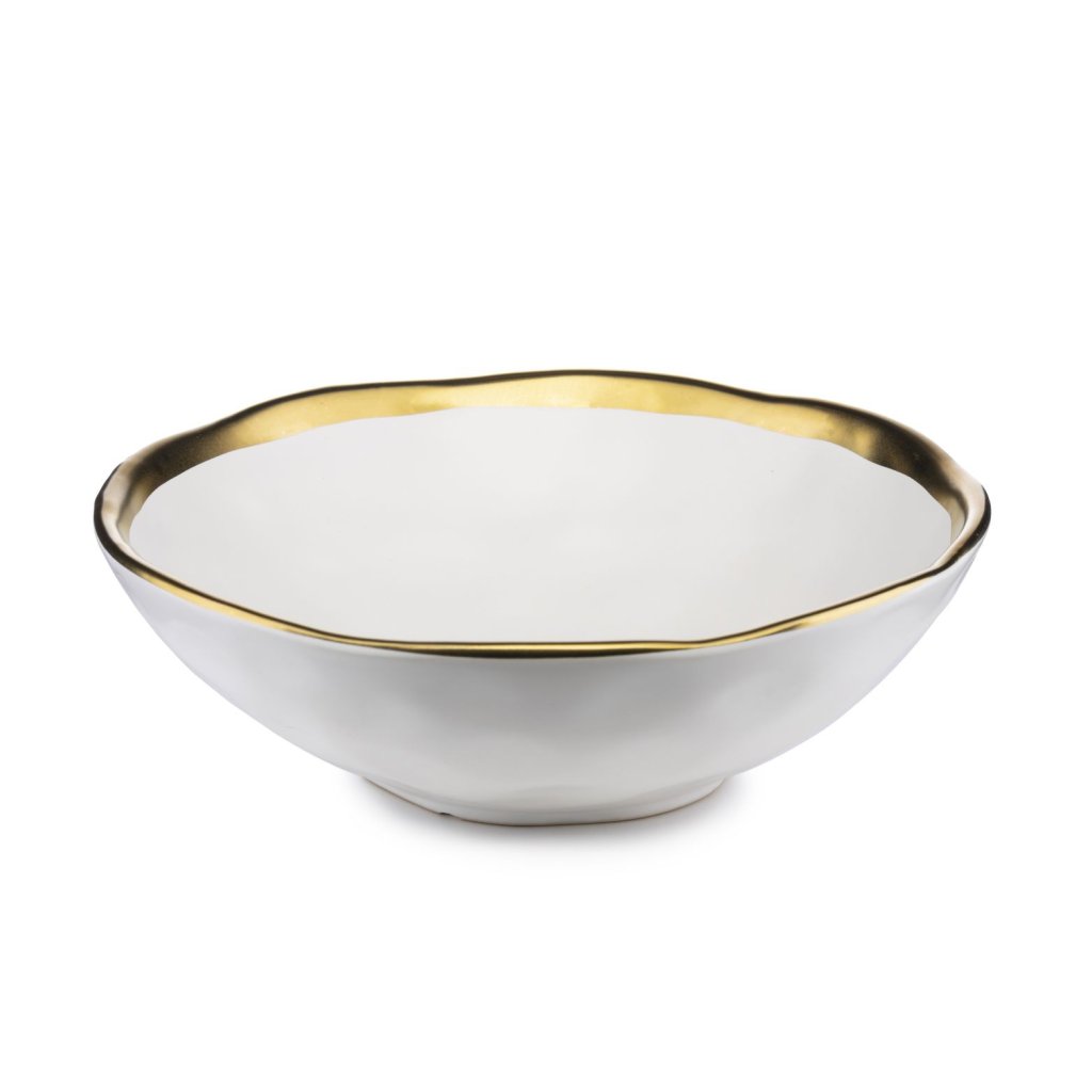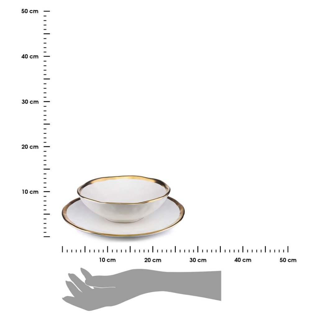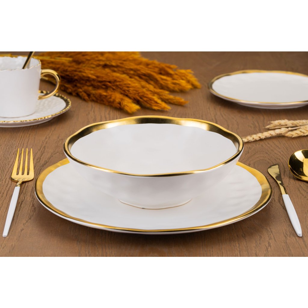 Keramická sada talířů sestávající z 8 prvků. Stylové nádobí z kolekce LISSA z bílé keramiky se zlatými okraji. Nepravidelná struktura dodává styl a modernost. Jedinečný design zapadne do glamour interiérů. Dokonale se bude hodit jak k elegantní večeři, tak ke každodenním jídlům. Talíř má vyšší okraj, díky čemuž se pohodlně používá.Nádoby se neměly mýt v myčce na nádobí. 4 x hluboký talíř: (fi) 20 cm