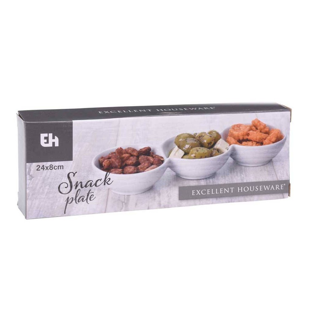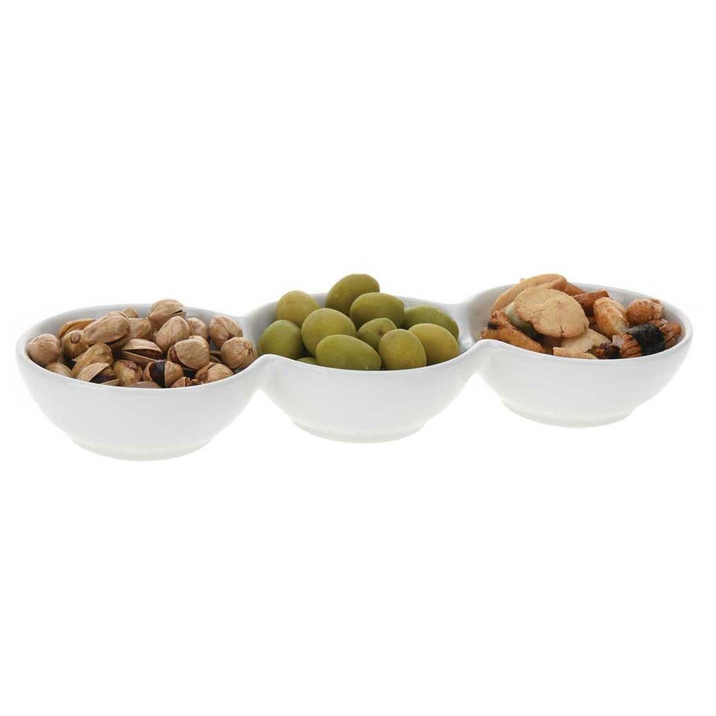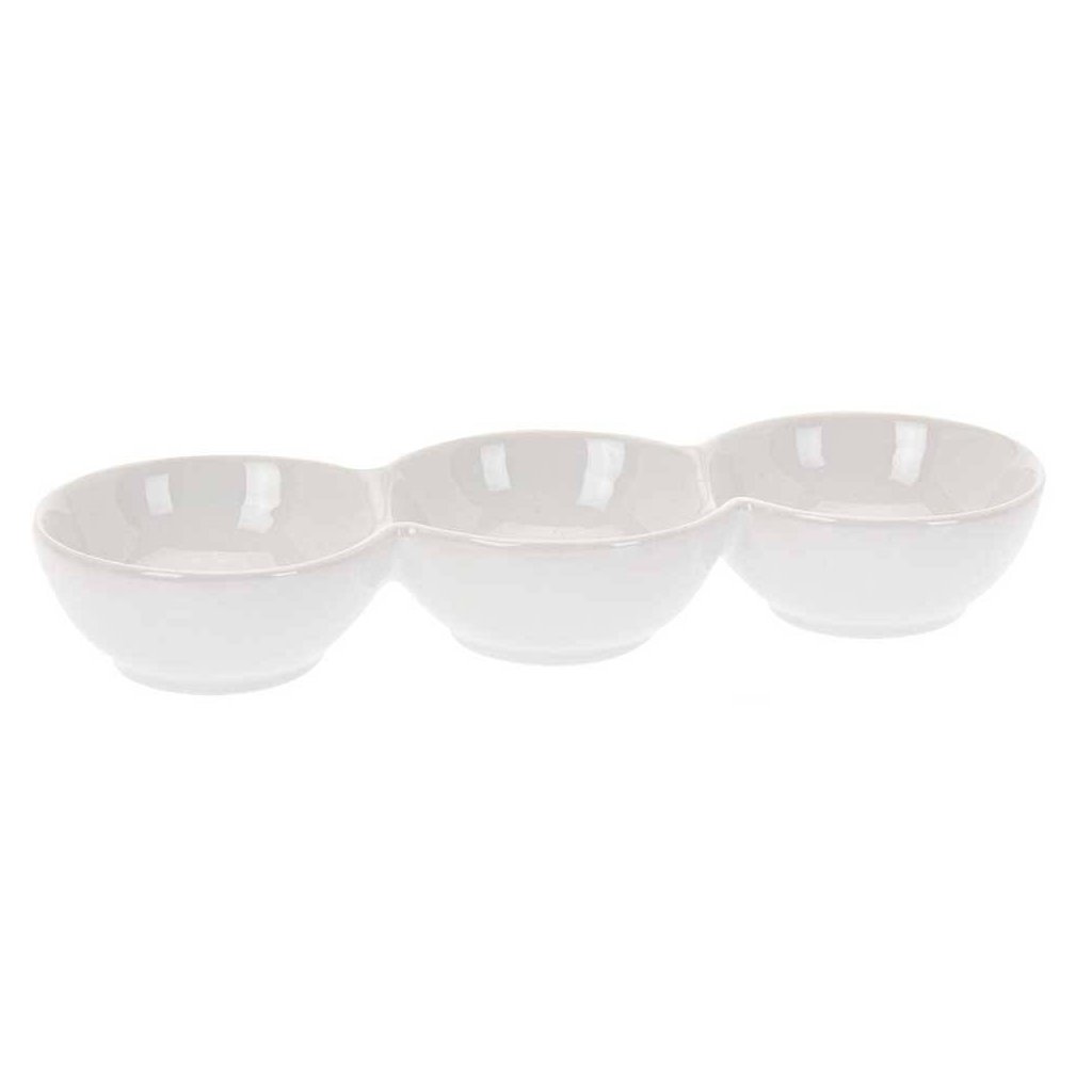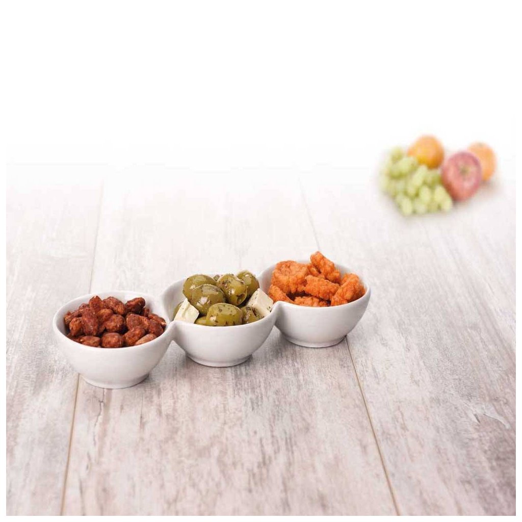 Miska na servírování občerstvení sestávající ze tří navzájem spojených keramických misek. Perfektní na oříšky, chipsy a různé druhy dipů. Sada misek poslouží jako originální tip na dárek.Doplňkové parametry