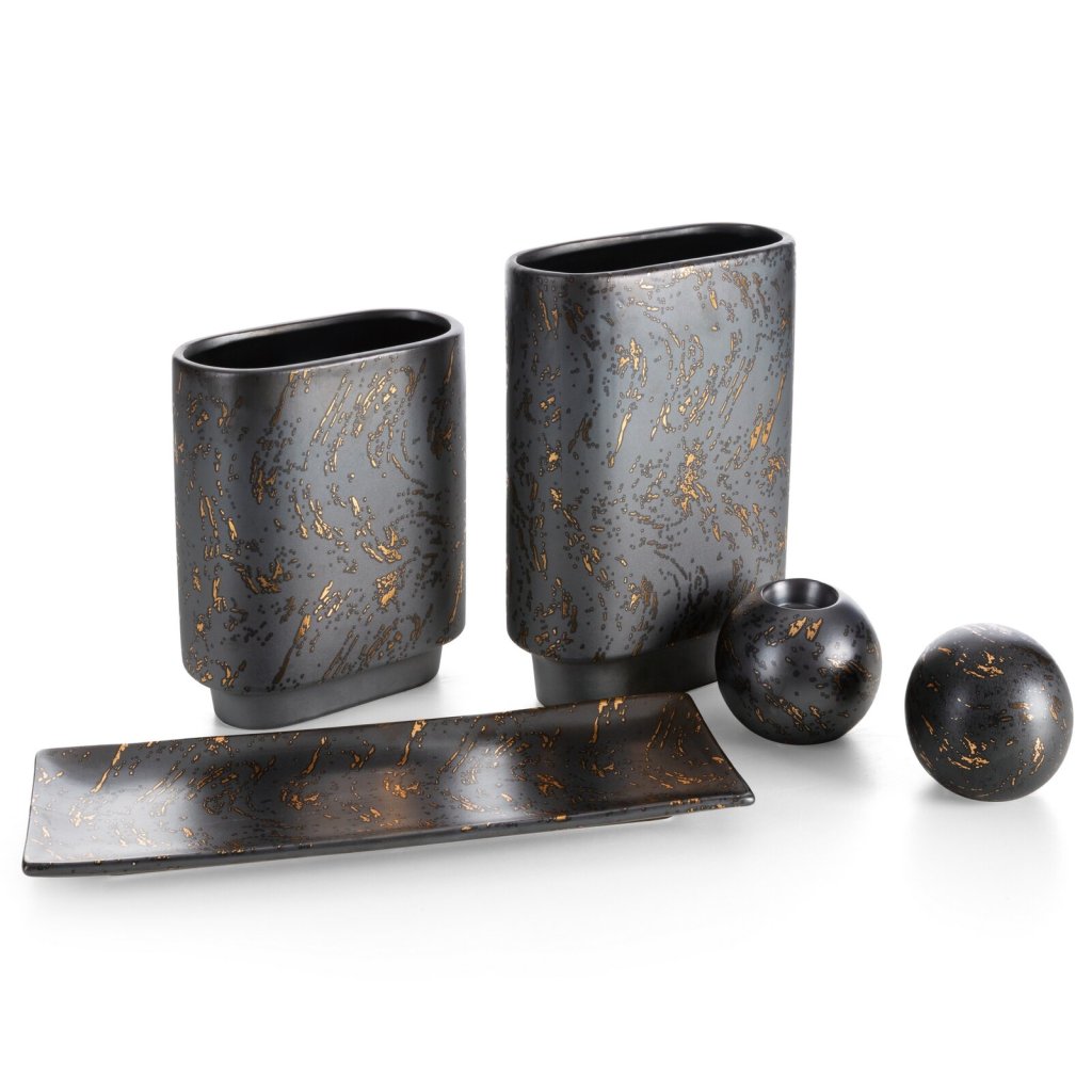 Váza ARIELA je elegantní a umělecký dekorativní prvek, který dodá interiéru jedinečný charakter. Váza je vyrobena z kvalitní keramické hlíny, je pevná a odolná a její ošuntělý vzor jí dodává kouzlo. Její jedinečný design a výrazná textura přitahují pozornost a vytvářejí zajímavý akcent v každém prostoru. Šířka: 20 cm, délka: 28 cm, barva: grafitová a zlatá, složení: keramická hlína.Doplňkové parametry
