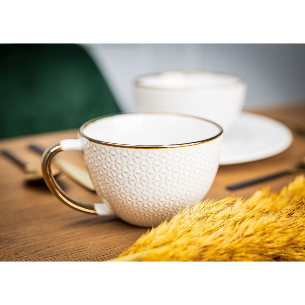 Elegantní, prostorný hrnek na kávu nebo čaj, který se vyznačuje nejen keramickým zpracováním, ale také zajímavým designem. Každý, kdo hledá krásný hrnek jako dárek nebo chce jednoduše upgradovat své nádobí, bude s ním spokojen. Hrnek lze používat v mikrovlnné troubě a myčce na nádobí.Doplňkové parametry