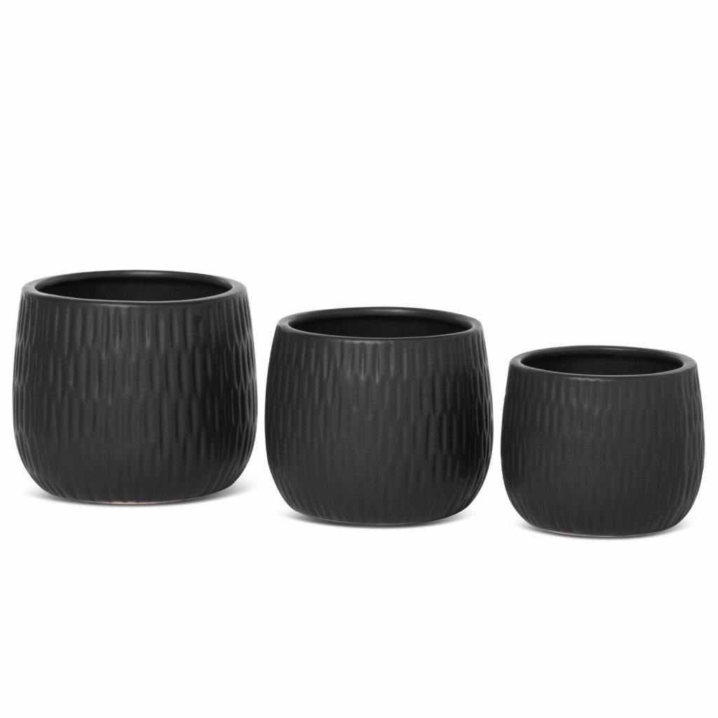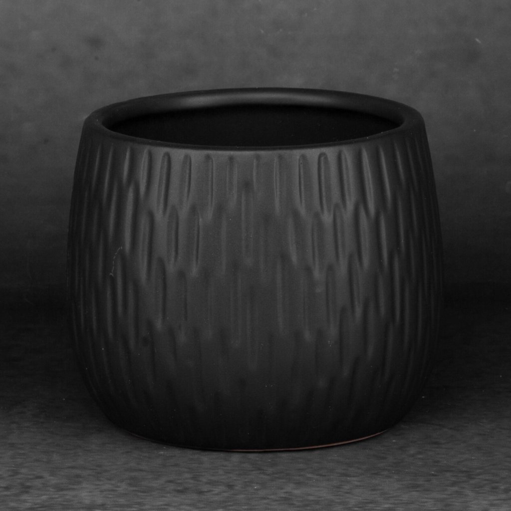 Dekorativní květináč, šířka: (fi) 14 cm, délka: 12 cm, barva: černá, složení: keramická hlína.Doplňkové parametry