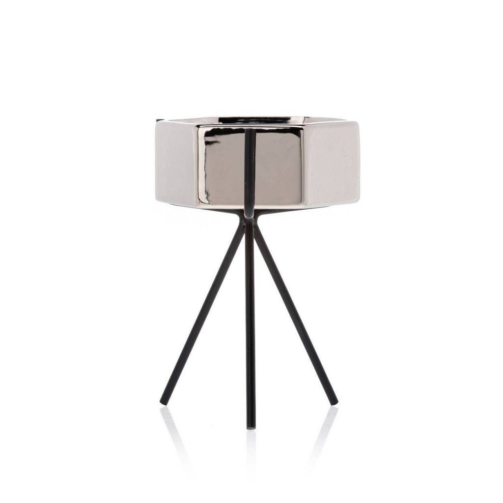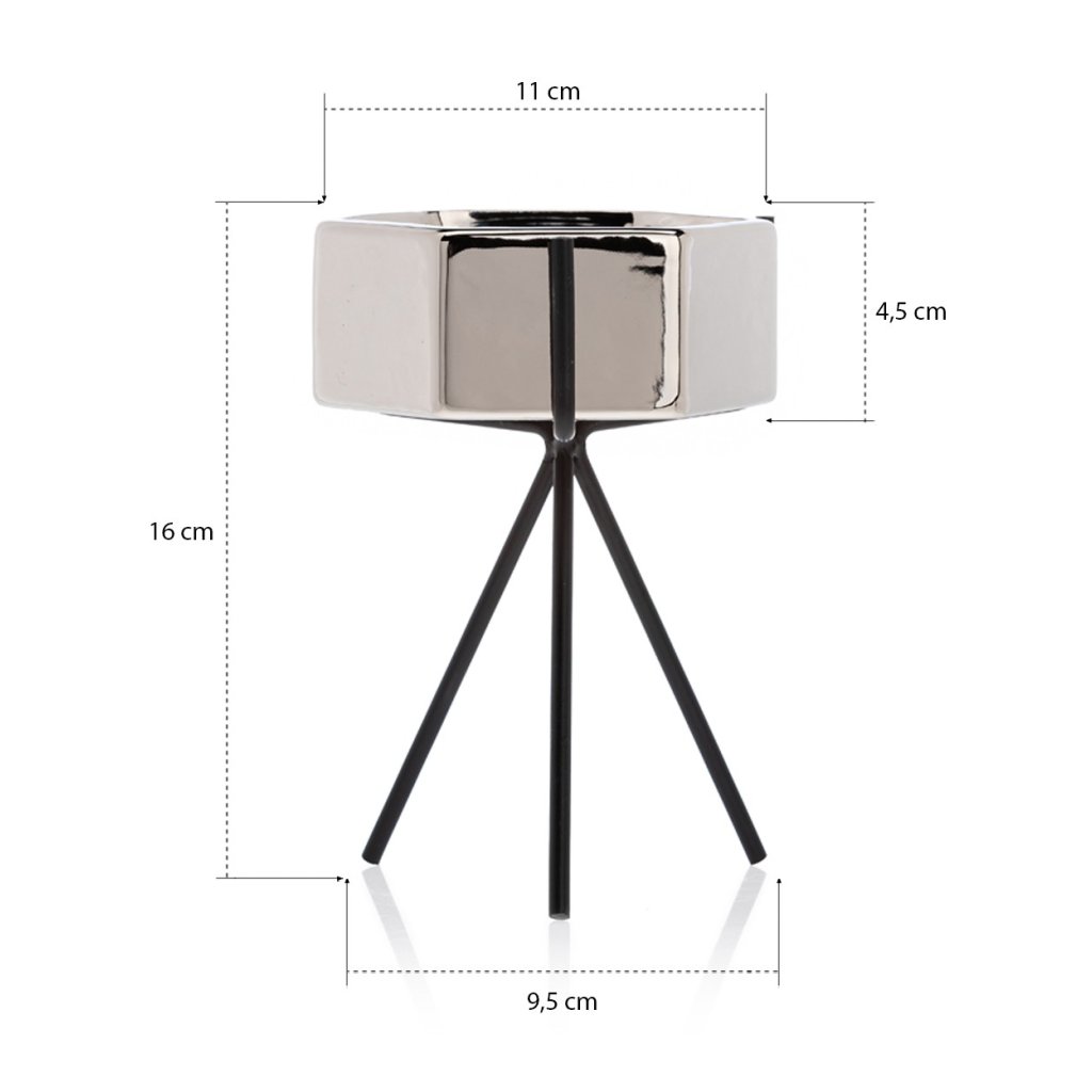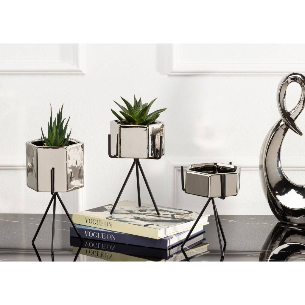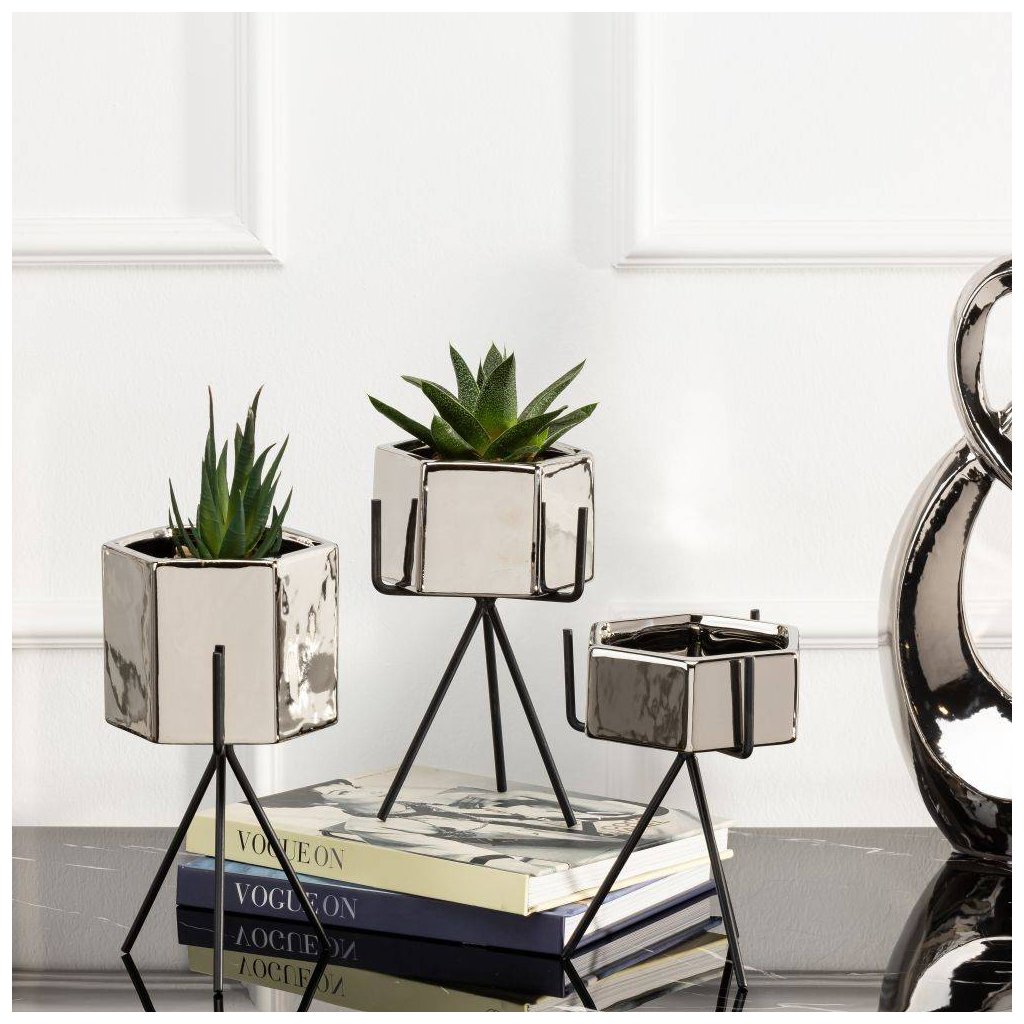 Květináč s elegantním kovovým stojanem, který zaujme svým designem a praktičností. Jeho moderní styl z něj činí krásnou dekoraci ideální do každého interiéru v domácnosti. Design dokonale ladí se zelenými rostlinami, které spolu vytvářejí harmonii estetiky a funkčnosti. Díky kovovému stojanu květináč působí noblesním dojmem.Produkt se pyšní odolností při které konstrukce zajišťuje bezpečnost rostlin. Květináč je vyroben z keramiky, nepraská, nedeformuje se a je vhodný prakticky pro všechny druhy rostlin.