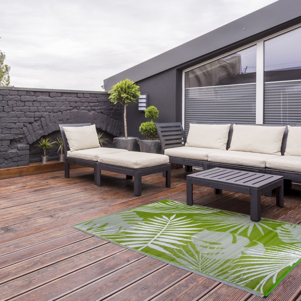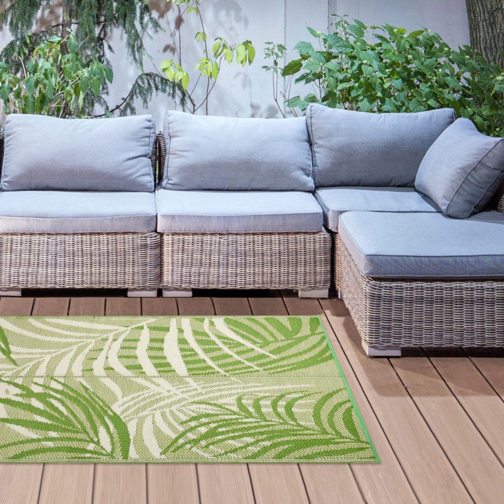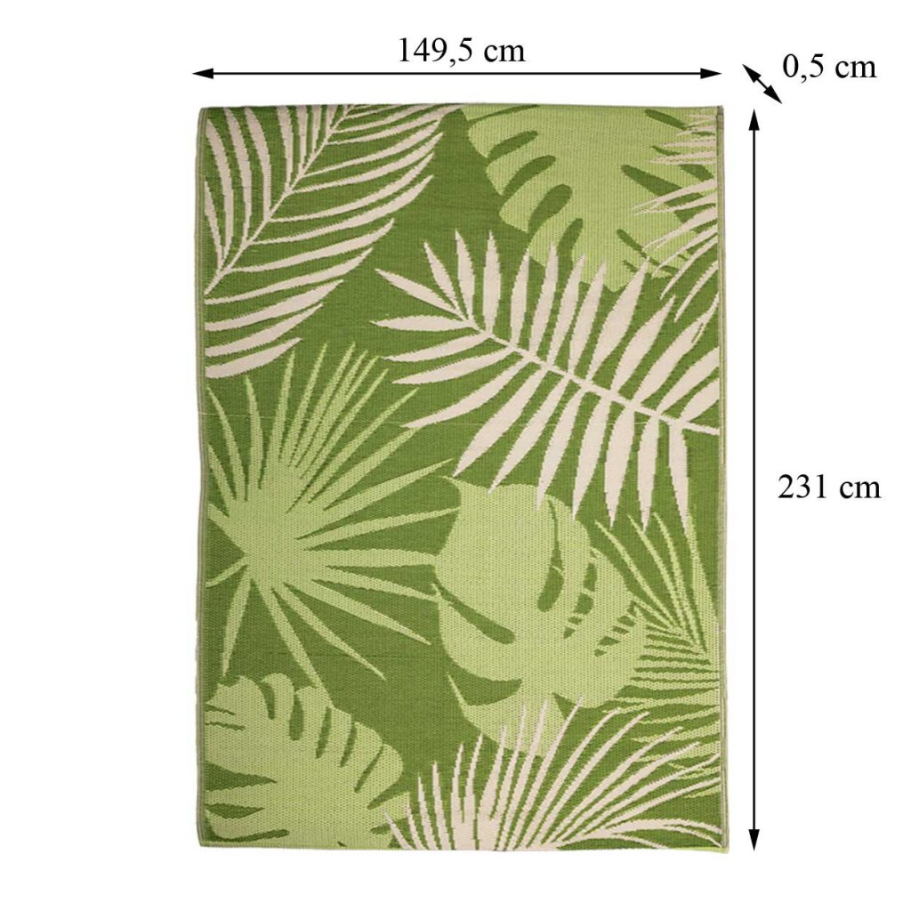 Koberec Jungle o rozměrech 149 × 231 cm je navržen pro použití v exteriéru – ideální na terasu, balkon nebo zahradu . Vyroben z odolného polypropylenu , výborně odolává povětrnostním vlivům, je trvanlivý a snadno se čistí , díky čemuž je vhodný pro každodenní používání venku.