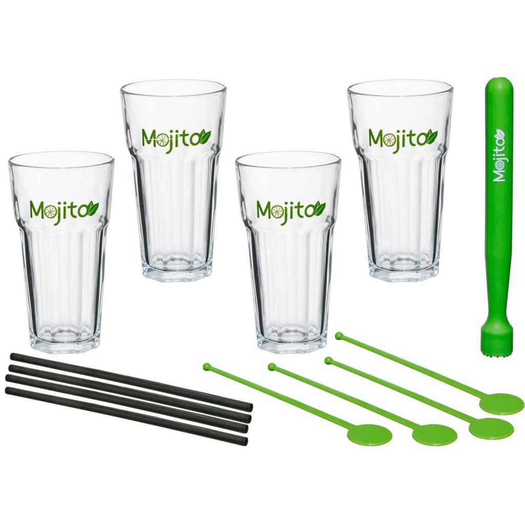 Sada na přípravu Mojita sestává ze 13 prvků: 4x sklenice, 4x brčka, 4x míchadlo a kočka na drcení lístků máty a limetky. S takovou sadou mojito nepochybně zapůsobíte na své hosty bez ohledu na příležitost. Sklenice jsou vhodné do myčky nádobí.Rozměry sklenic: průměr 8 cm x výška 15 cm; objem 360 ml