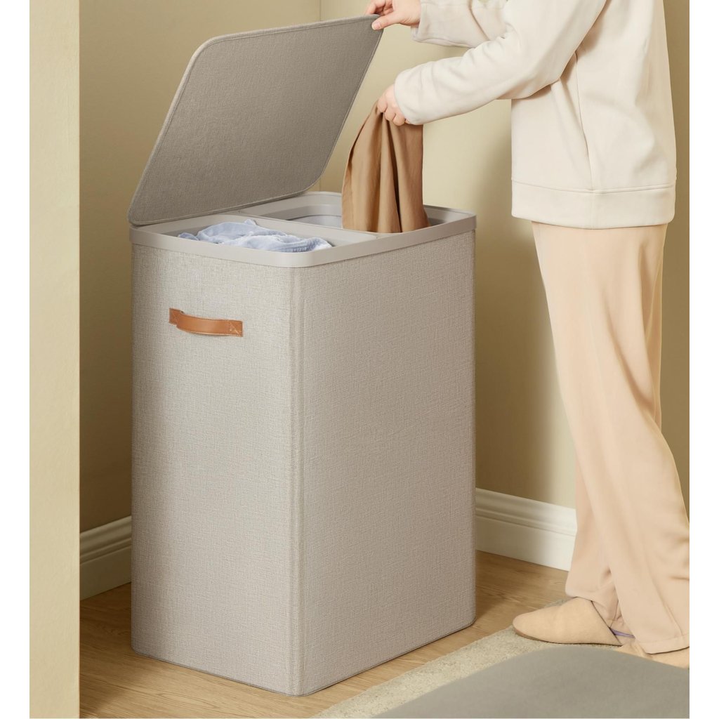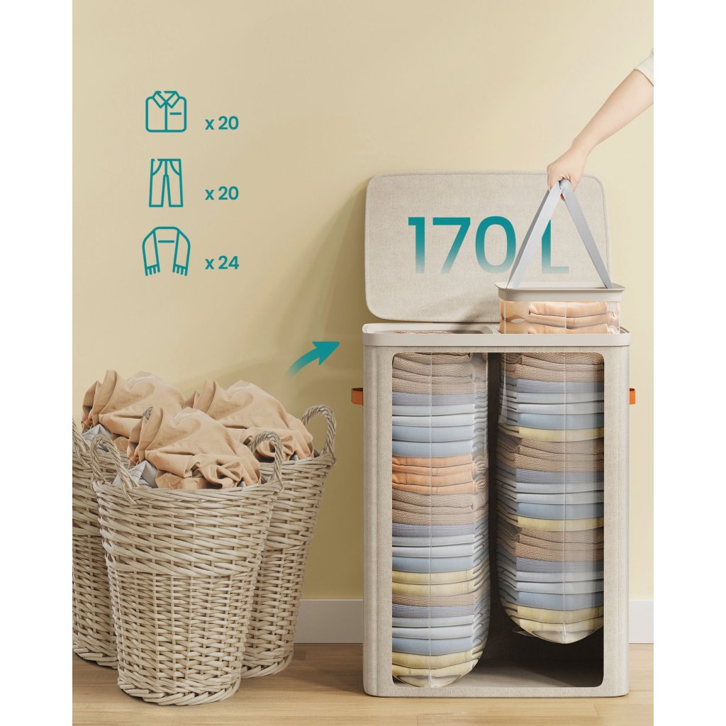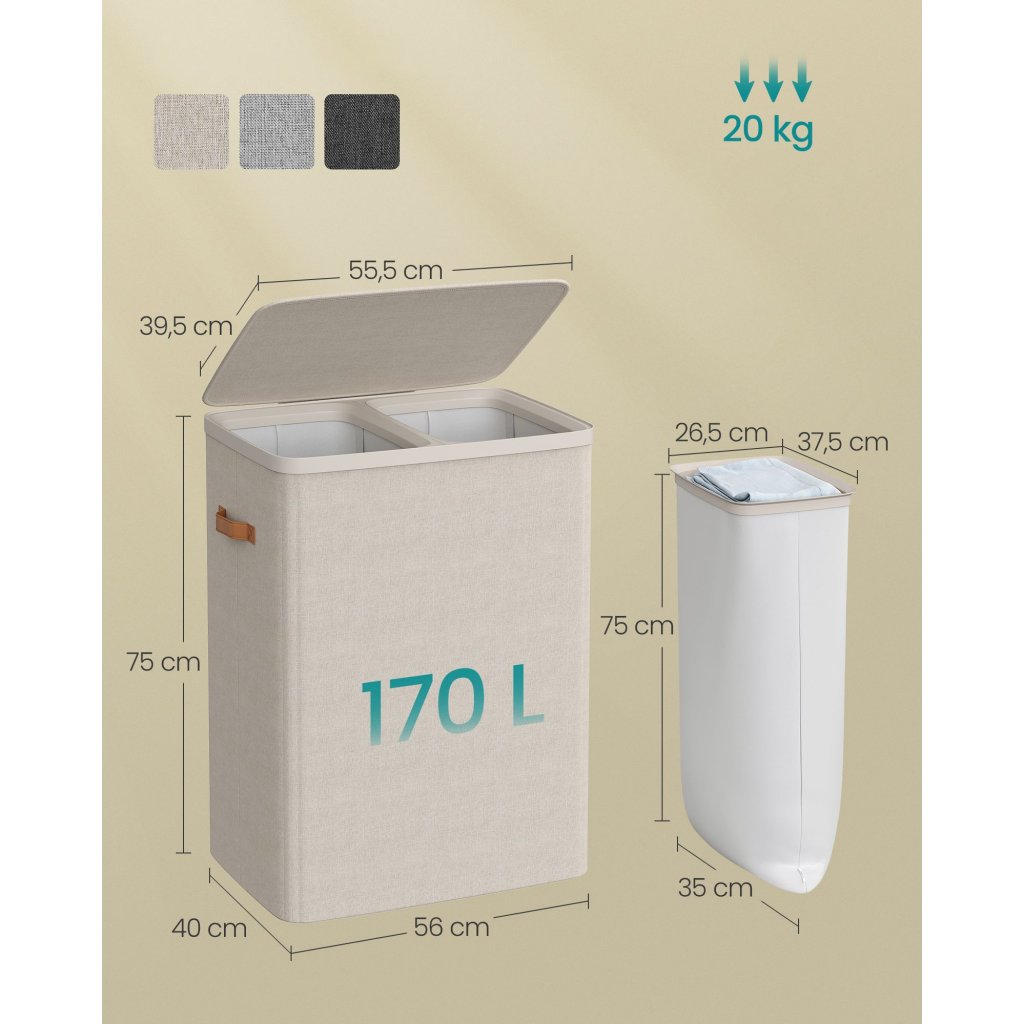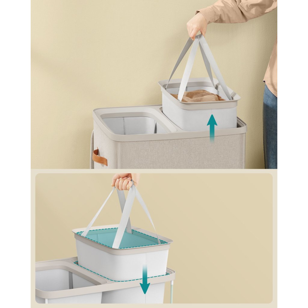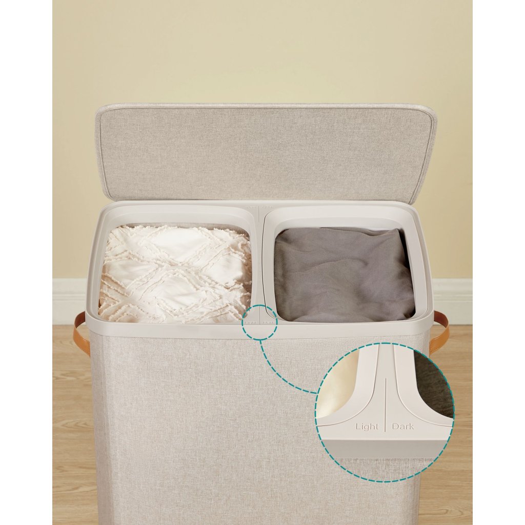 Koš na prádlo Daisy Beige o objemu 170 litrů nabízí praktické a přehledné řešení třídění prádla v každé domácnosti. Dvě samostatné přihrádky s označeními světlé a tmavé usnadňují intuitivní rozdělení oblečení před praním , čímž šetří čas a eliminují riziko zabarvení.