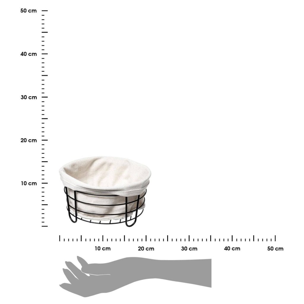 Černý košík s bílou látkovou podšívkou, který bude praktickou dekorací interiéru. Košík se skvěle hodí k servírování chleba či ovoce a poslouží i jako doplňkové místo pro různé druhy předmětů. Stylové zpracování a elegantní tvar vytvářejí krásný a funkční doplněk, který se bude hodit v každé domácnosti.Průměr: 21 cm