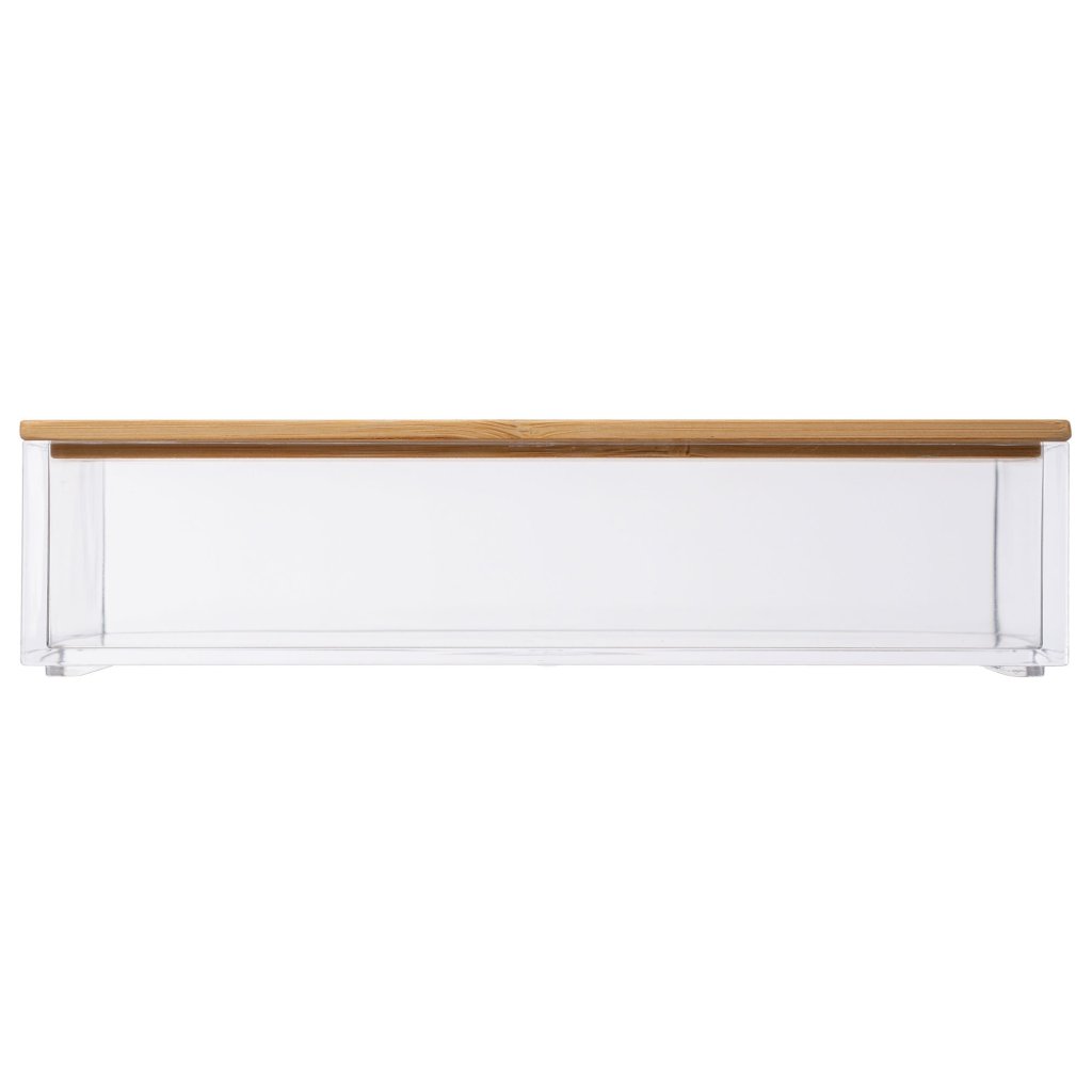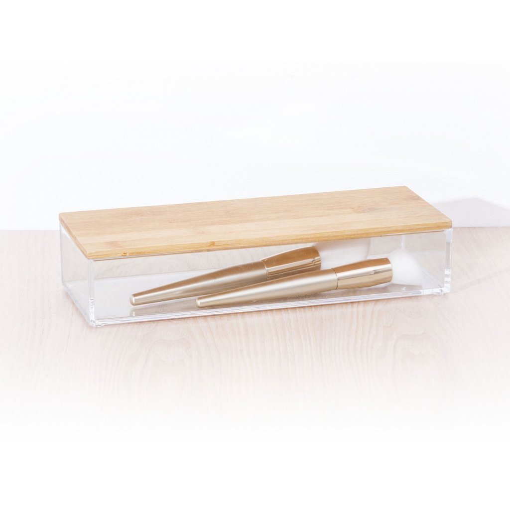 Koupelnová nádoba vám pomůže dobře uspořádat drobnosti, výborně se hodí k odkládání kosmetiky a kosmetických doplňků. Vyrobený z průhledného plastu a bambusu působí moderně a elegantně, hodí se téměř do každého stylu interiéru. Jednotlivé prvky nádoby do sebe dokonale zapadají a vytvářejí ucelený celek. Uzavřená nádoba chrání obsah před prachem a poškozením.Doplňkové parametry