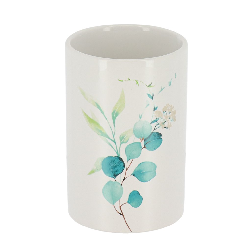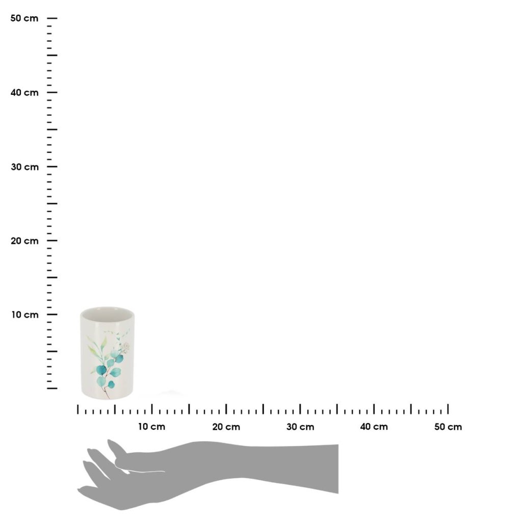 Koupelnový pohár Aquarelle z keramiky vyniká jemným motivem eukalyptových větviček v tónech zelené a modré , který dodává koupelně klidný, přírodní nádech . Díky svému funkčnímu tvaru a univerzálnímu bílému podkladu se hodí do moderních i klasických interiérů. Tuto sklenici využijete jako držák na zubní kartáčky, kosmetické štětce nebo jiné koupelnové doplňky . Jeho lesklý keramický povrch se snadno čistí a dlouhodobě si zachovává svůj elegantní vzhled. Pohár je součástí kompletní kolekce Aquarelle , kterou můžete sladit s dávkovačem na mýdlo, mýdelničkou a WC soupravou a vytvořit si tak harmonickou a stylovou koupelnu inspirovanou přírodou.Doplňkové parametry