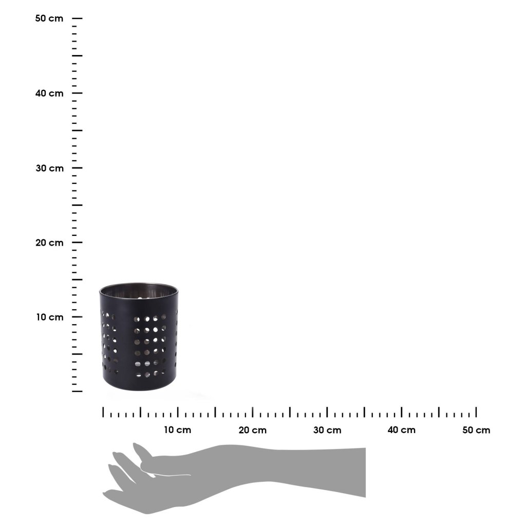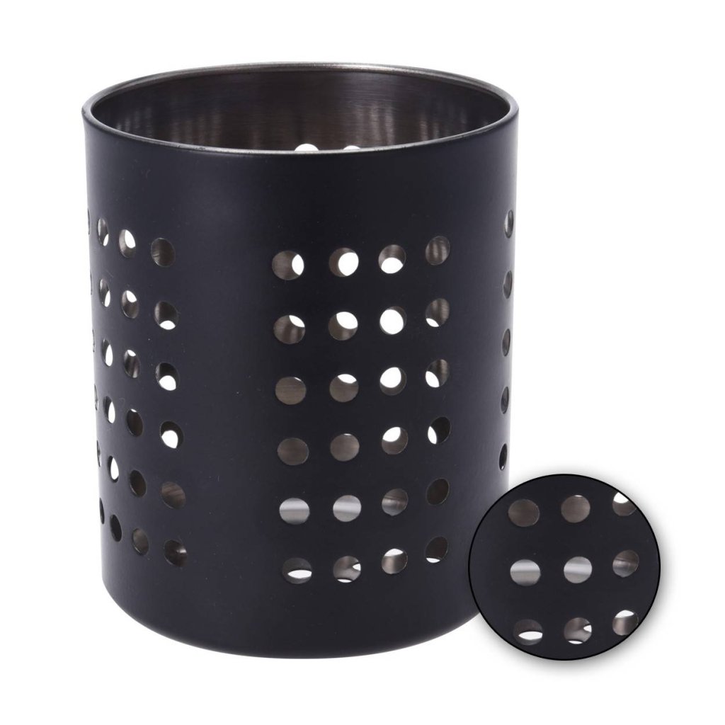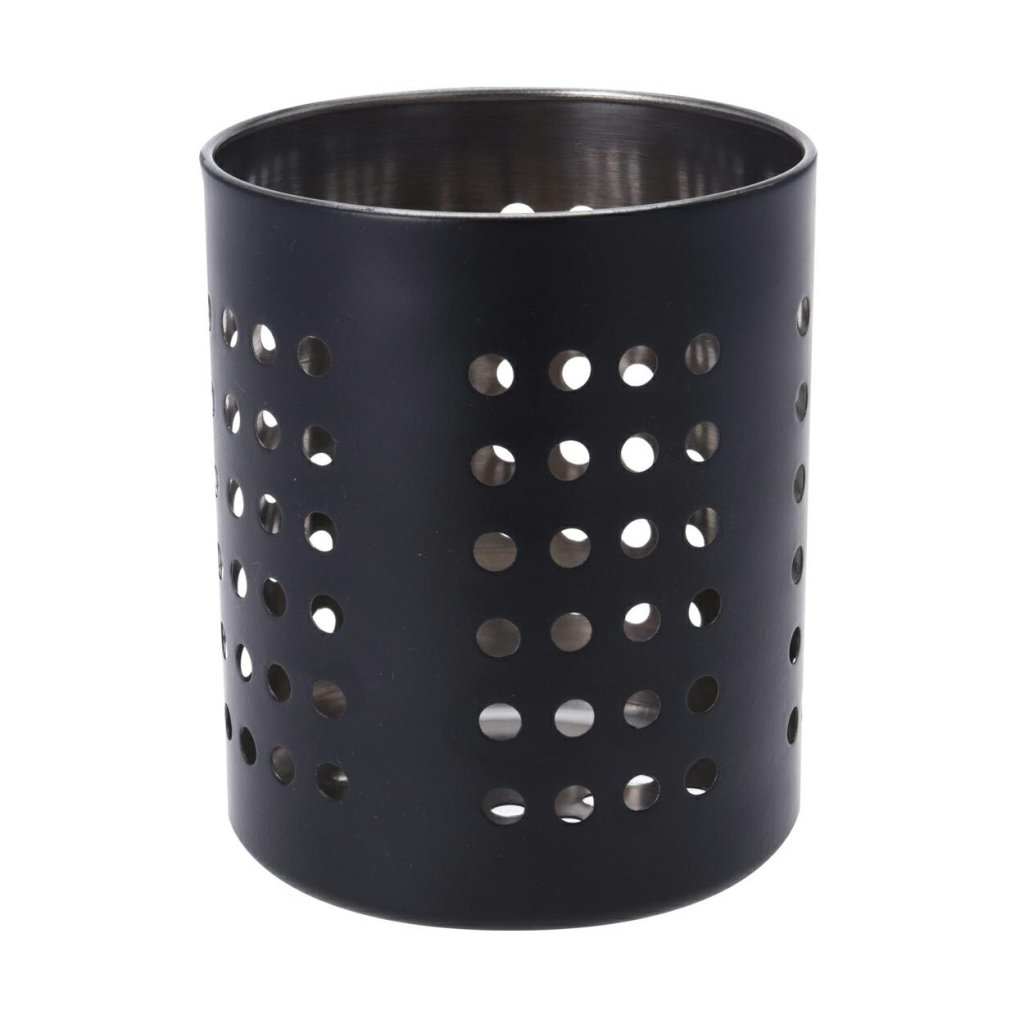 Nádoba na příbor vyrobená z kovu s matnou černou povrchovou úpravou. Umožní vám uspořádat kuchyňské doplňky a může fungovat také jako odkapávač. Kulaté otvory na jeho povrchu zajišťují dobré větrání, díky čemuž je sušení hygieničtější. Určitě ji ocení lidé, kteří rádi tráví čas v kuchyni, neboť díky ní mohou mít potřebné doplňky po ruce. Kulatý tvar a minimalistický styl dodávají nádobě nadčasový vzhled. Lehce zapadne do stylu každé kuchyně.Doplňkové parametry