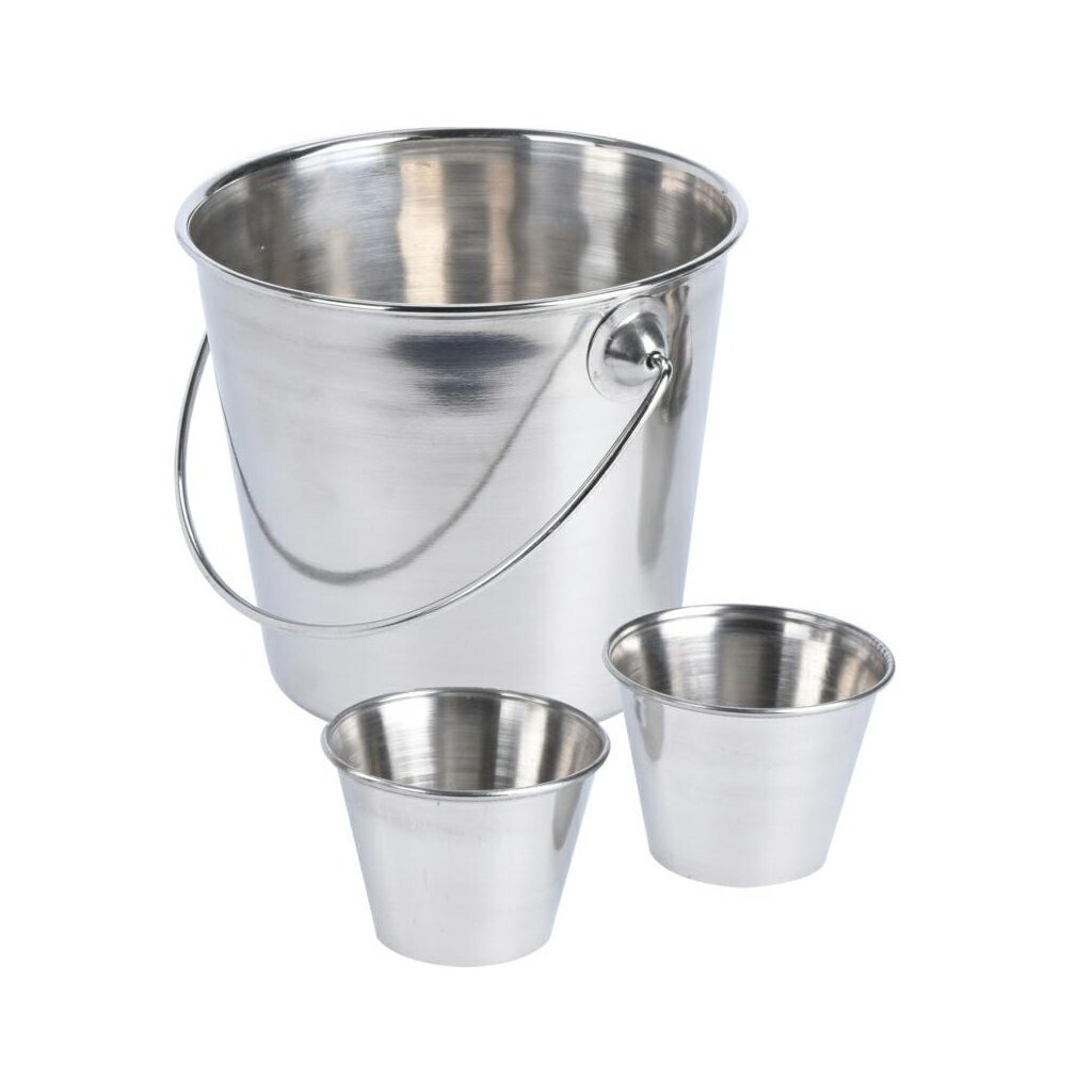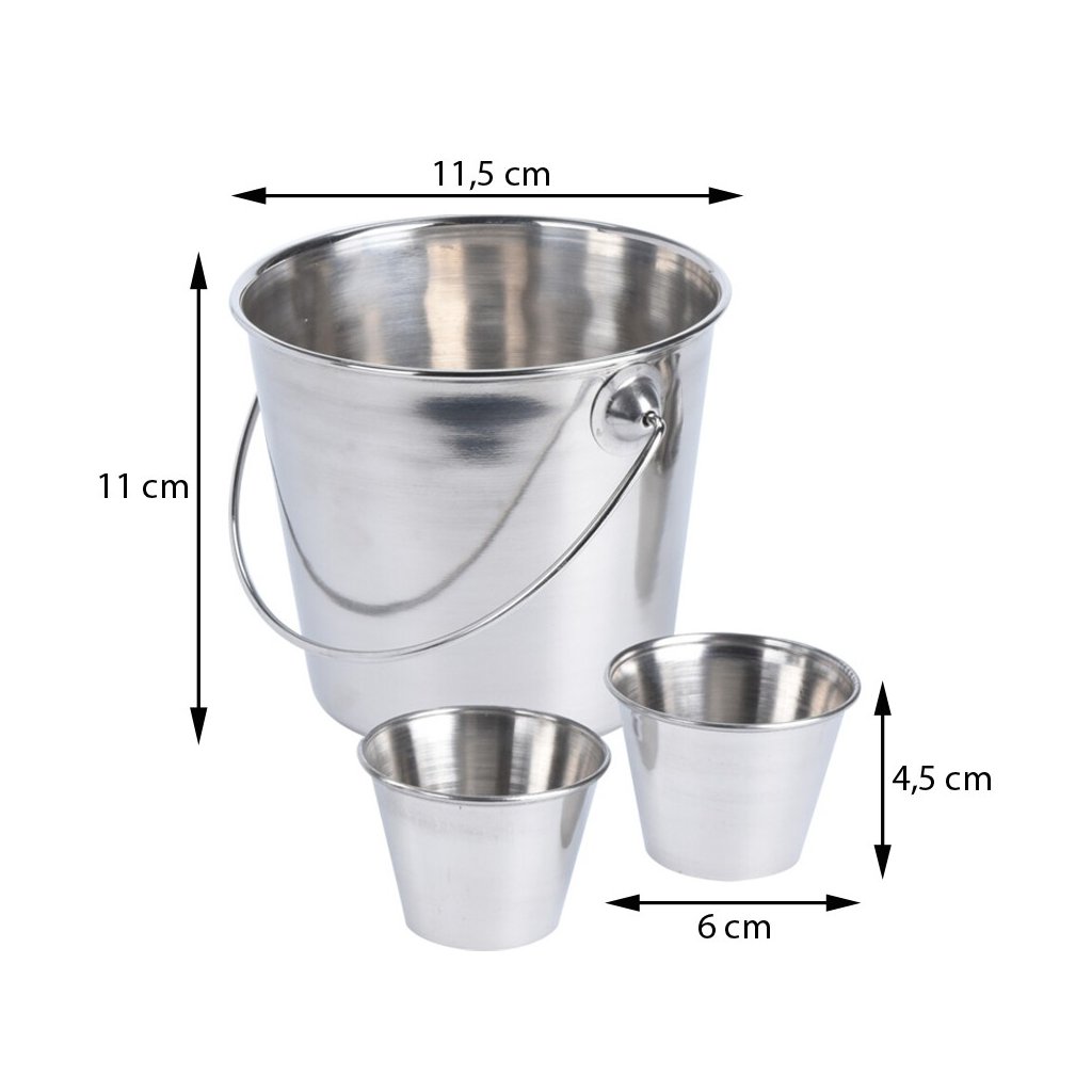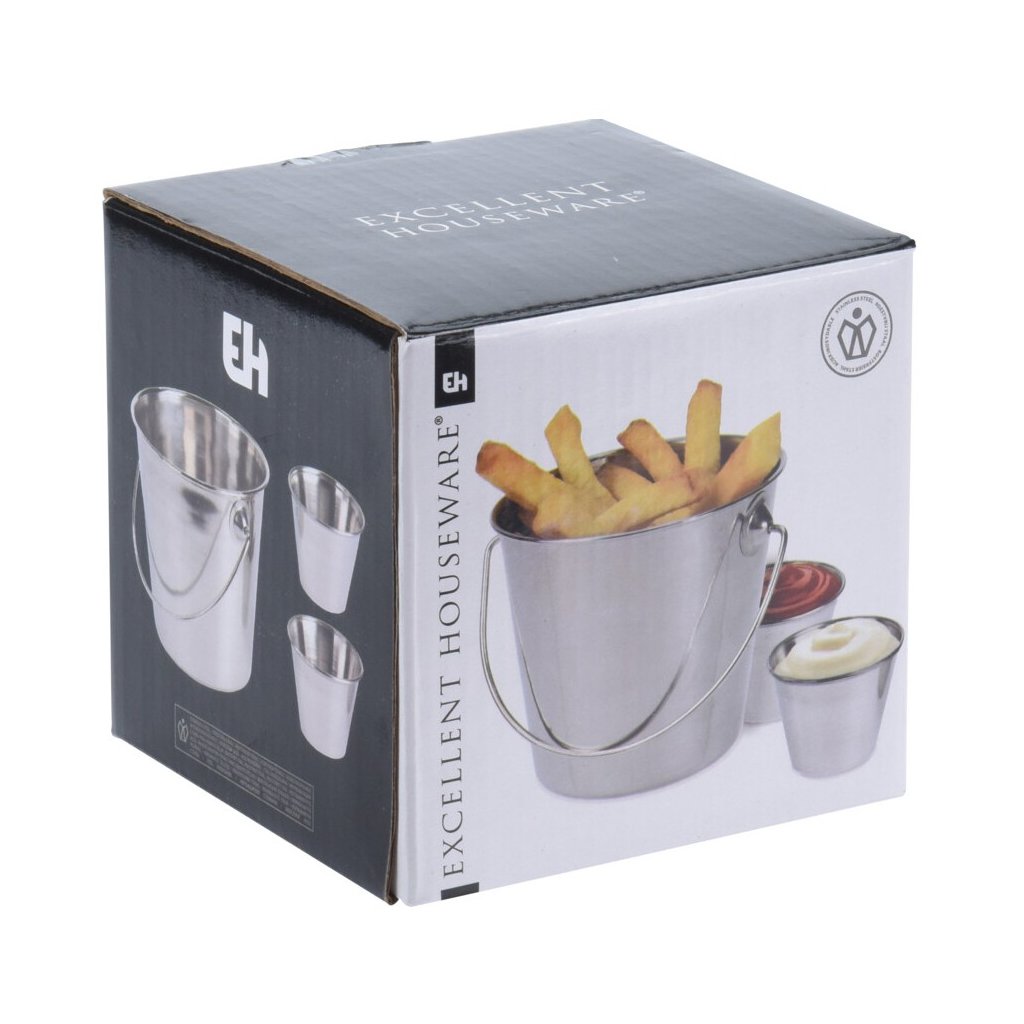 Souprava na podávání hranolků a jiných pochutin jistě zpestří stůl a překvapí hosty formou podávání. Kbelík na hranolky a dvě nádoby na omáčky jsou vyrobeny z nerezavějící oceli, díky čemuž se snadno čití a vydrží dlouhá léta. Souprava je ideální pro domácí použití, jakož i do restaurace či baru.Rozměry kbelíku: 11,5x11 cm