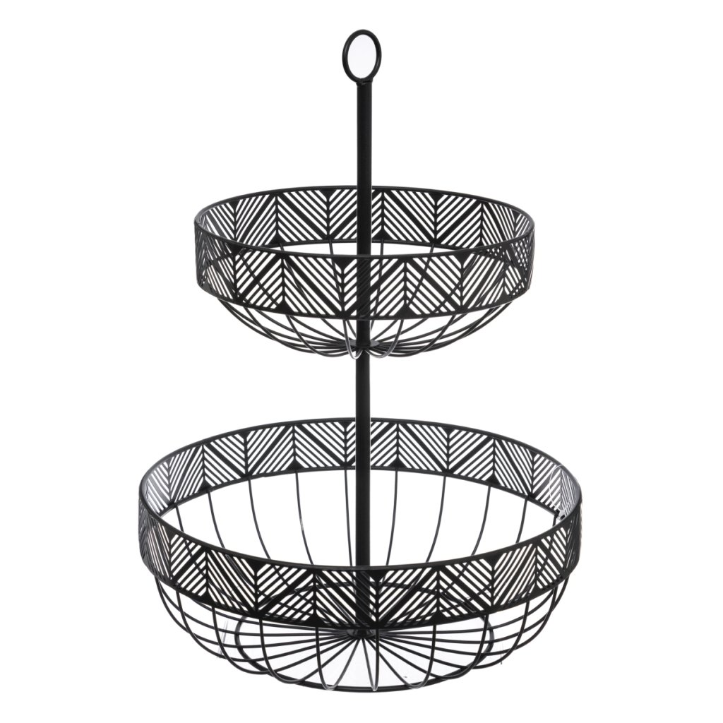 Černý, mimořádně praktický stojan se dvěma košíčky na ovoce nebo zeleninu. Designová forma vytváří krásný a funkční doplněk, který bude užitečný v každé domácnosti. Díky svému jedinečnému designu se rychle stane výkladní skříní vaší kuchyně, jídelny nebo obývacího pokoje. Jeho dalšími přednostmi je pohodlná rukojeť a odolná konstrukce z kvalitního kovu.Nemyjte v myčce nádobí.