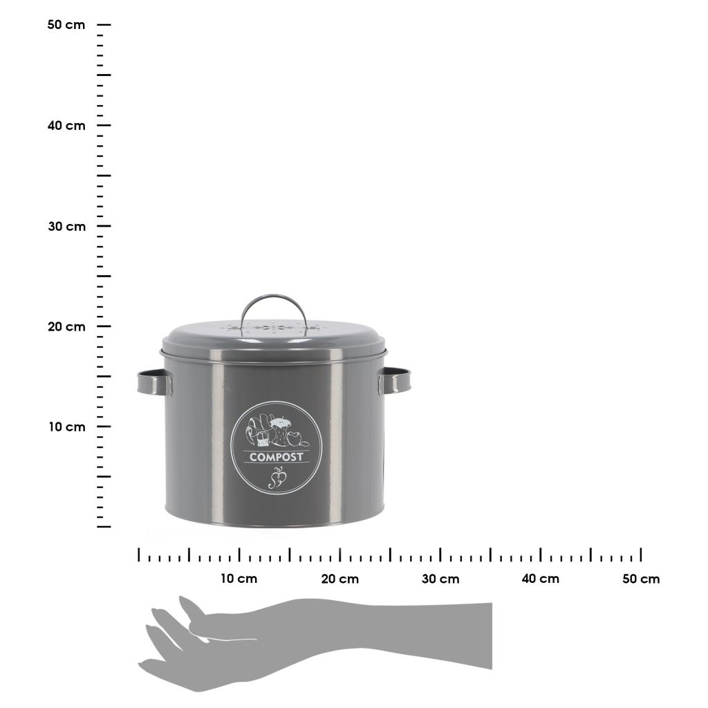 Elegantní a zároveň velmi praktický domácí kompostér. Doporučuje se ke sběru biologicky rozložitelných zbytků potravin z kuchyně, které lze později přeměnit na kompost. Kompostér je ideální mimo jiné pro: kávovou a čajovou usazeninu, vaječné skořápky a recyklaci mokrého odpadu. Kompostér je vyroben z šedé oceli, s uhlíkovou filtrační vložkou, která dokonale pohlcuje nepříjemné pachy. Je určen pro vnitřní i vnější použití. Kompostér a filtrační vložku omyjte ručně pod tekoucí vodou, můžete použít prostředek na mytí nádobí.Nemyjte v myčce nádobí.