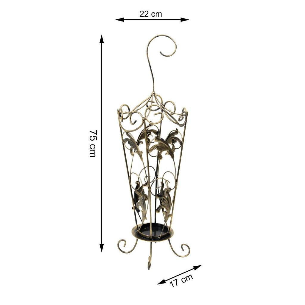Stojan na deštníky ve tvaru deštníku, který dodá eleganci a styl každému interiéru. Celý stojan je vyroben z kovu. Stojan na deštníky je černé barvy s ručně broušenou zlatou patinou.Doplňkové parametry