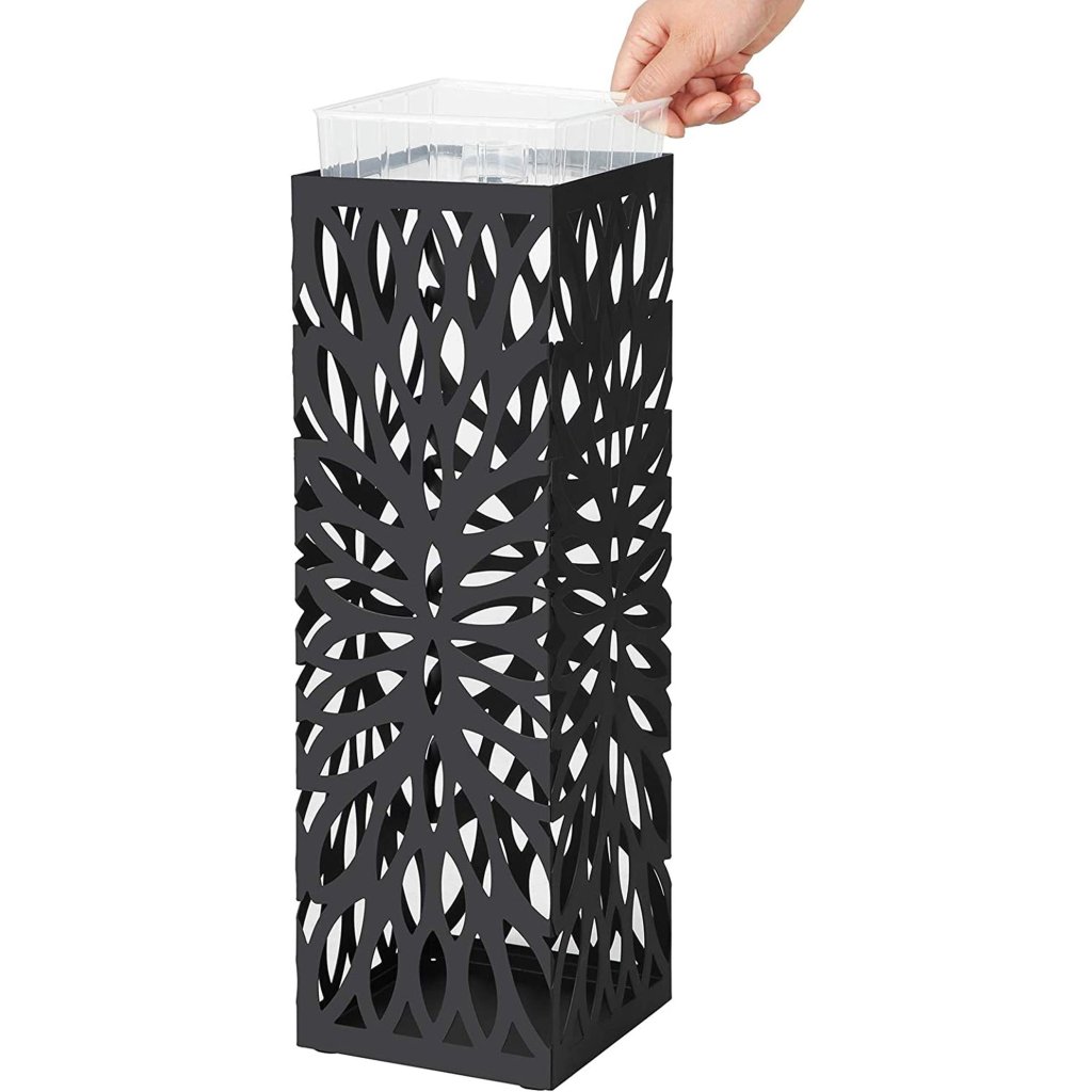 Stojan na deštníky je funkční i stylový. Prolamovaný černý motiv dokonale zapadne do většiny interiérů – loftových, industriálních, minimalistických, ale také moderních. Stojan na deštníky nabízí nejen místo pro uložení deštníků, ale poslouží i jako skvělá dekorace do vaší předsíně či chodby. Pevné zpracování a práškové lakování zaručují vysokou kvalitu a odolnost proti poškrábání. Stojan na deštníky má dostatek místa pro dlouhé deštníky a má další 4 háčky na kratší deštníky.Doplňkové parametry