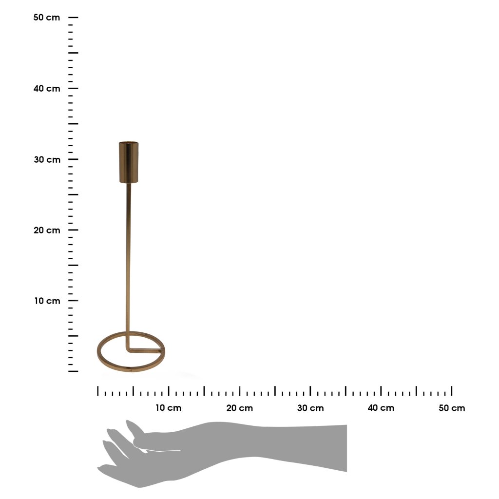 Vysoký kovový svícen Freya ve zlatém provedení spojuje moderní design s klasickou elegancí a stane se výrazným prvkem každého interiéru. S výškou 31,5 cm a průměrem 10,5 cm působí štíhle, ale zároveň stabilně díky široké základně.