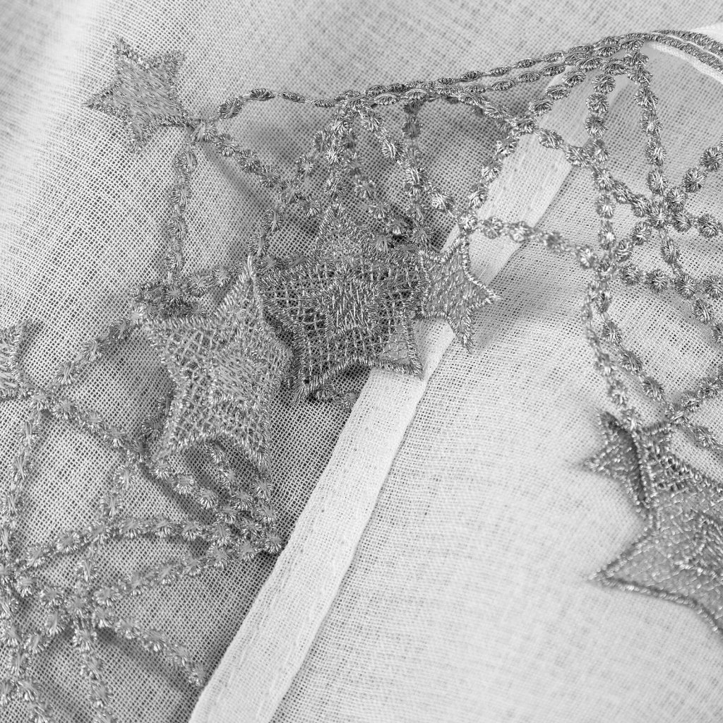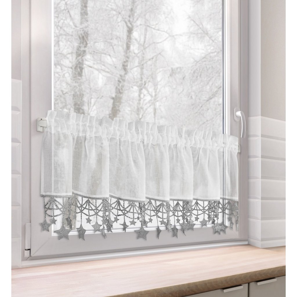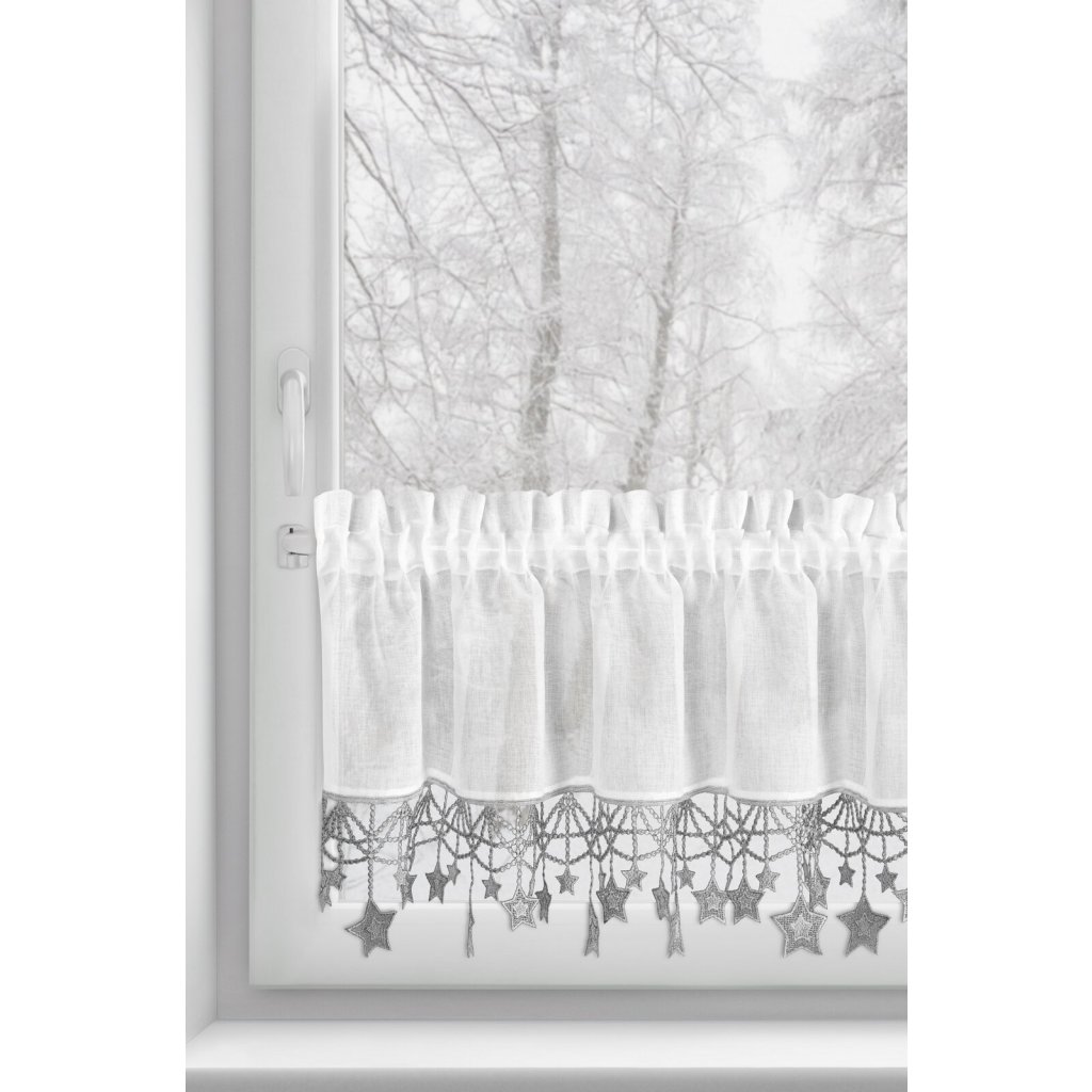 Stylová záclonka se svátečním lemováním o rozměrech 150 × 30 cm je vyrobena z jemné tkaniny s gramáží 75 GSM . Bílá barva vnáší do interiéru svěžest a čistotu. Materiál tvoří 100% polyester , který je praktický a odolný při každodenním používání. Barva hvězd: stříbrná.Doplňkové parametry